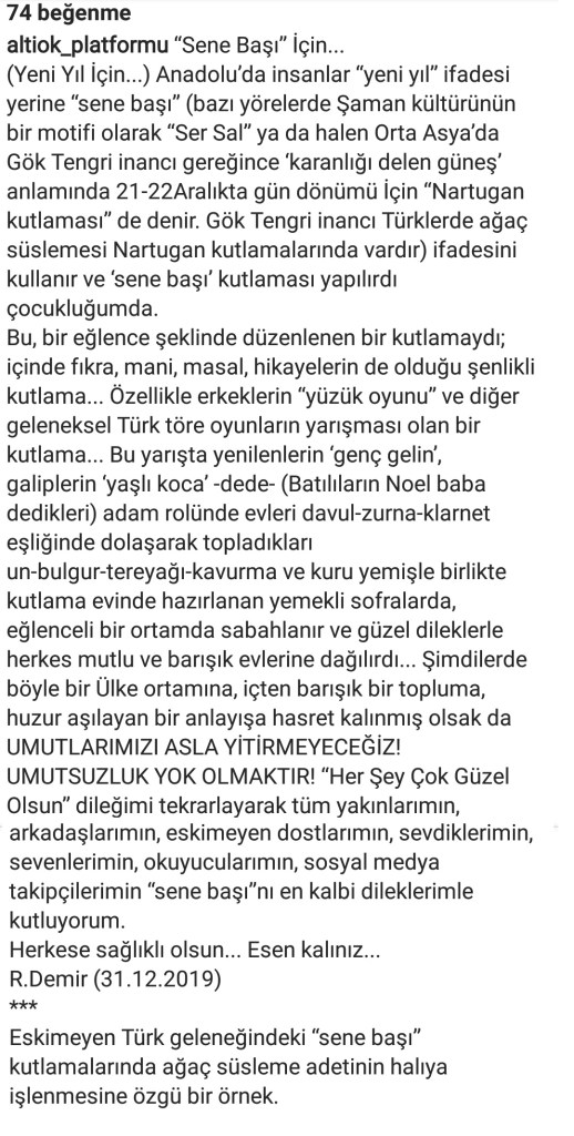 Sümerolog Muazzez İlmiye ÇIĞ, Ben bunu her yılbaşı göndermeye çalışıyorum ama yaygınlaşıyor mu, unutuluyor mu anlaşılamıyor! Ya da inanılmıyor! Yine de bilmekte yarar var! Yılbaşı ile Christmas (Noel)’i aynı şey sananlar için…