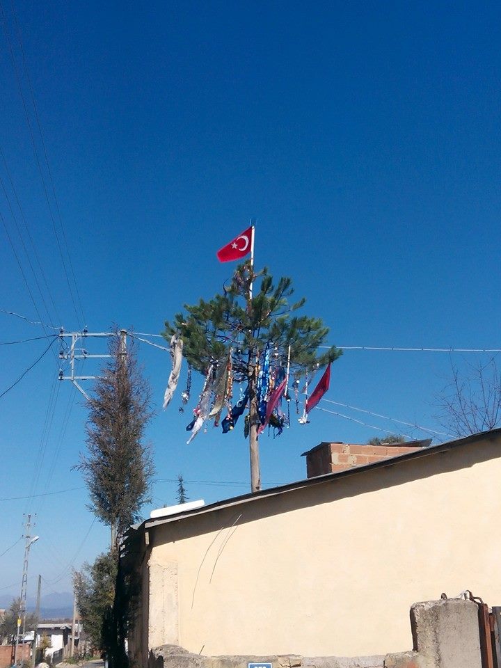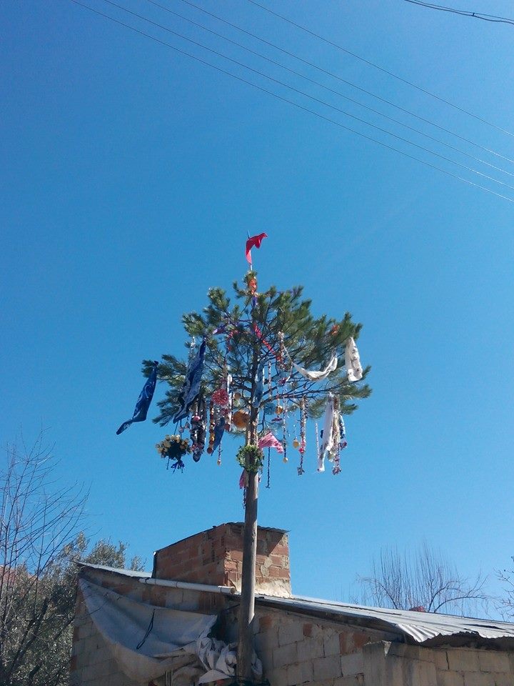 Taylan Ramazan “Uşak, Banaz’ın köylerinde de vardı bu adet… Ancak son yıllarda yalnızca bayrağa tülbent bağlanarak yapıyorlar… Eskiden böyle çama, poşu, tülbent ve küçük cep aynaları da bağlarlardı.” diyor.