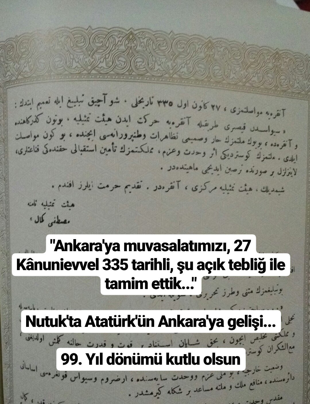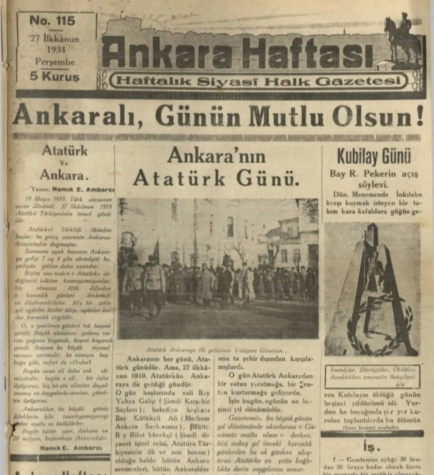 “Dil ve Tarih Coğrafya Fakültesi’nin bulunduğu yerde toplanan heyetten Rıfat Efendi, “Hoş geldiniz, safa geldiniz. Kademler getirdiniz. Memleketimizi aydınlattınız. Canla başla sizinle beraberiz!..” demişti. Mustafa Kemal Paşa ve arkadaşları otomobillerle istasyona doğru ilerlemişlerdi. Mustafa Kemal Paşa, gelirken istasyonda bulunan İngiliz Kumandanı Mister Vitol, yağız bir atın üstüne binmiş duruyor; Forbus adlı bir İngiliz, fotoğraf çekiyordu. İstasyondan ayrıldıktan sonra şehre doğru ilerlediler. İleride Millet Meclisi olacak binada Fransız bayrağı çekilmişti. Millet bahçesindeki barakalarda bulunan Fransız askerleri de yüksek duvarın üstünden bu manzarayı seyrediyorlardı. Otomobil, Karaoğlan’a doğru ilerlemiş ve buradan Hacı Bayram Camii’ne gelmişti. Kurbanlar kesilmiş, dualar edilmiş, Hacı Bayram Veli türbesi ziyaret edildikten sonra Hükümet Konağına gidilmişti. 700 piyade 3000 atlı birlikten oluşan Zeybek Alayının önünde 20 zurna ve 50 davul yeri göğü inletmişti. İki sıra halinde yürüyen kılıçlı seymenler, zaman zaman zeybek oyunu oynuyorlardı. Mustafa Kemal Paşa; Hükümet Konağında kendisine sevgi gösterisinde bulunan halka; “Vatandaşlarım, ne şu, ne bu kuvvet bizi kurtarabilir. Bizi sizin gibi fedakâr ve cesur halkımız kurtaracaktır” şeklinde hitap etti. Kolordu ziyaretinden sonra Ankara Valiliği tarafından ikametlerine tahsis edilen Ziraat Mektebi’ne doğru yola çıkmışlardı.“(2)