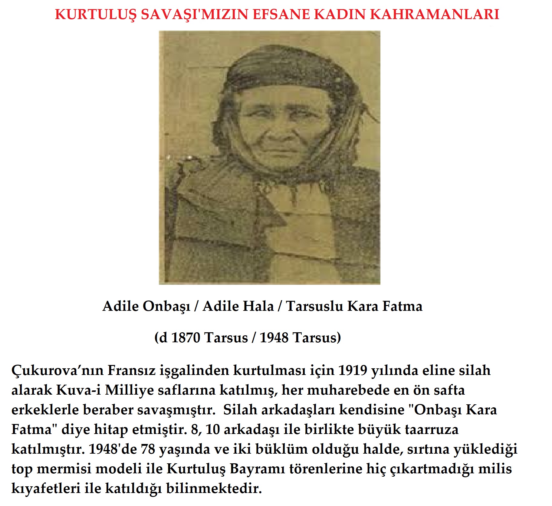 Kurtuluş Savaşında kahramanlıkları görülen kadın mücahitlerimizden olan Adile Hala 1870 yılında Tarsus’ta doğmuştur. Çukurova’nın Fransız işgalinden kurtulması için 1919 yılında eline silah alarak Kuva-i Milliye saflarına katılmış, her muharebede en ön safta erkeklerle beraber savaşmıştır. Lakabı Onbaşı Kara Fatma’dır ancak yine Kurtuluş Savaşında görev alan Erzurumlu Onbaşı Kara Fatma ile karıştırılmaktadır, dört yıl müddetle üzerinde milis kıyafeti , elinde mavzer, başında siyah kalpak, belinde fişeklik ve ayağında deri çizme ile O’nu her silahlı çatışmada ve baskınlarda görebiliyoruz. Mersin Kuva-i Milliye Reisi rahmetli Lütfü OĞUZCAN (Şair Ümit Yaşar OĞUZCAN’ın babası) bey her toplantıda ve her törende O’ndan rahmet ve minnetle bahsederdi.