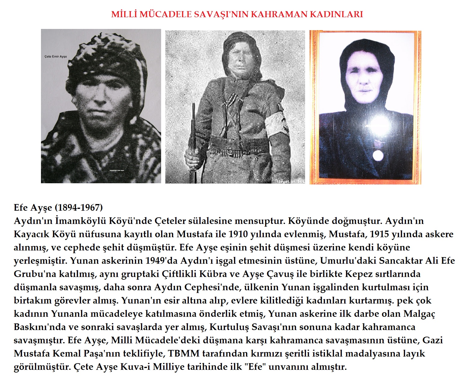 Ayşe Çavuş adıyla bilinir. Bir şehit binbaşının eşi olan Ayşe Hanım, İzmir’in işgali sonrası bir atlı süvari müfrezesi kurarak Aydın yöresindeki direnişe katıldı. Çetelerle birlikte yürüttüğü mücadeleye daha sonra müfrezesi ile düzenli ordunun resmi bir parçası olarak devam etti.[1] 9 Eylül 1922’de İzmir’e giren Türk kıtaları içinde yer aldı.