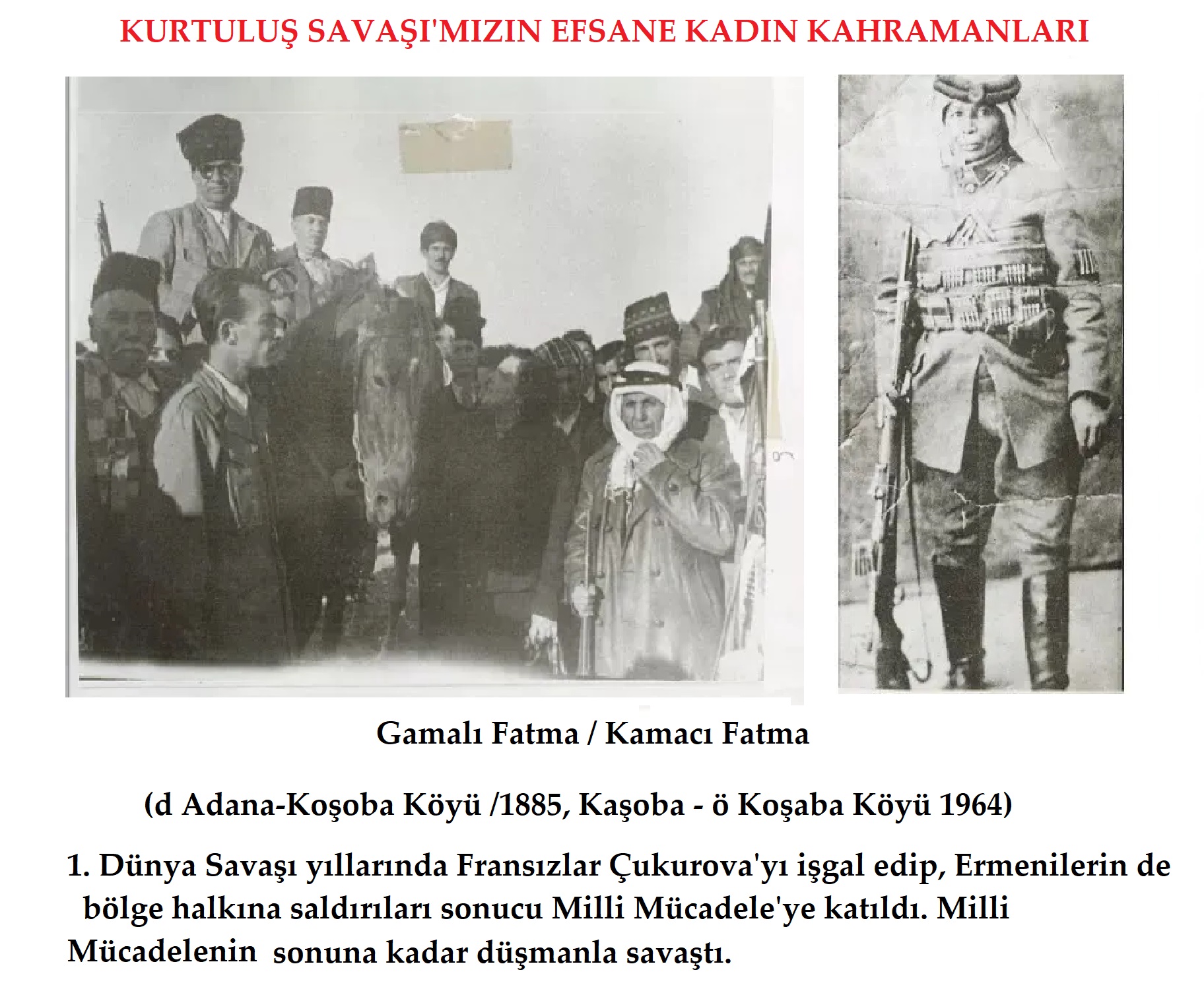I. Dünya Savaşı’ndan sonra Çukurova‘nın Fransızlarca işgali ve Ermeni saldırıları başlayınca kendi köyünden İbo Osman Ağa‘nın Kuvâ-yıi Milliye müfrezesine katıldı. Çetenin ilk başarısı, Kokarçeşme’de Ermeni çeteleri püskürtmekti. Belemedik–Hacıkırı arasında kalan bir yerde ırzına geçme teşebbüsünde bulunan bir düşman askerini koynunda sakladığı kama ile öldürdü. Bu olaydan sonra Gamalı (Kamalı) Fatma adıyla anılır oldu.