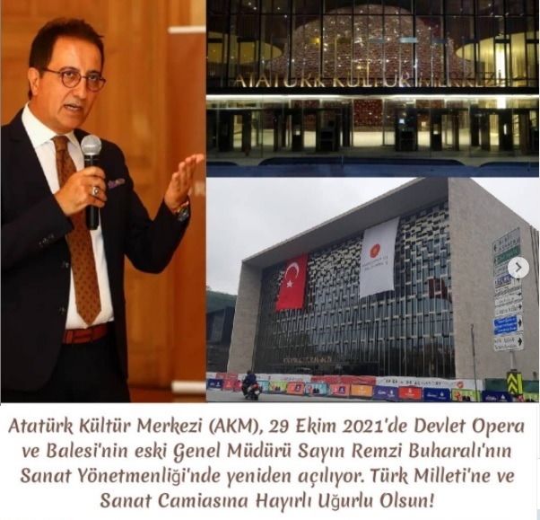 Atatürk Kültür Merkezi #AKM, İstanbul’da Taksim Meydanı’nda bulunan, opera, bale, tiyatro, konser ve kongre amacı ile kullanılan içinde bir sergi salonu ve sinema da yer alan kopleks bir yapıdır. Şu anda yeniden inşa edilen ve ülkemiz için çok büyük değerleri barındıran bu sanat yuvası, 29 Ekim 2021’de gözbebeğimiz Cumhuriyet Bayramımızda yine çok takdir ettiğim, ülkemizin sanat alanında nice organizasyonlara imza atmış, Devlet Opera ve Balesi eski genel müdürü sevgili Remzi Buharalı’nın sanat yönetmenliğinde yeniden açılıyor. İktidarın zannedersem şimdiye kadar yaptığı en anlamlı ataması bu olmuş! #RemziBuharalı gibi işinin ehli, liyakat sahibi bir duayenin böylesi önemli bir kültür merkezinde sanat yönetmenliği yapacak olması sanatçılarımızın yüzünü güldüreceği gibi belli ki bundan böyle sanat adına ülkemizde birbirinden farklı etkinliklerin bizleri beklediği müjdesini de veriyor.