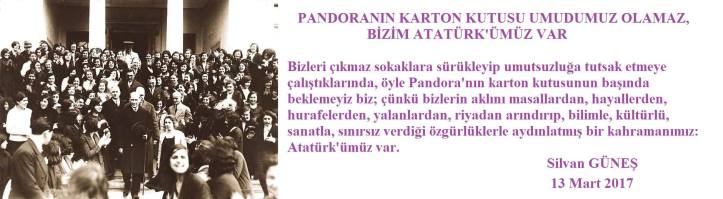 Bizleri çıkmaz sokaklara sürükleyip umutsuzluğa tutsak etmeye çalıştıklarında, öyle Pandora’nın karton kutusunun başında beklemeyiz biz; çünkü bizlerin aklını masallardan, hayallerden, hurafelerden, yalanlardan, riyadan arındırıp, bilimle, kültürlü, sanatla, sınırsız verdiği özgürlüklerle aydınlatmış bir kahramanımız: Atatürk’ümüz var.