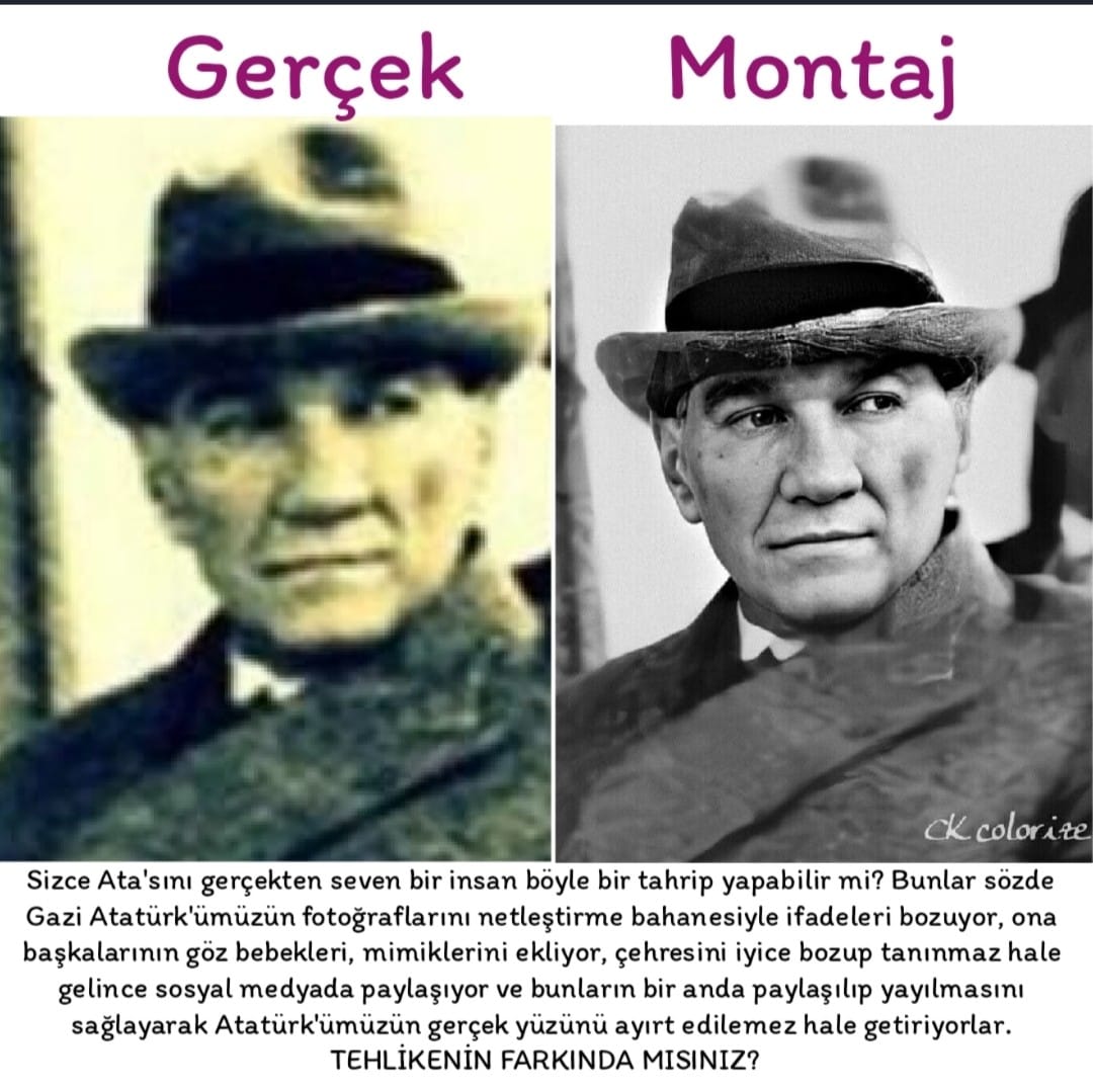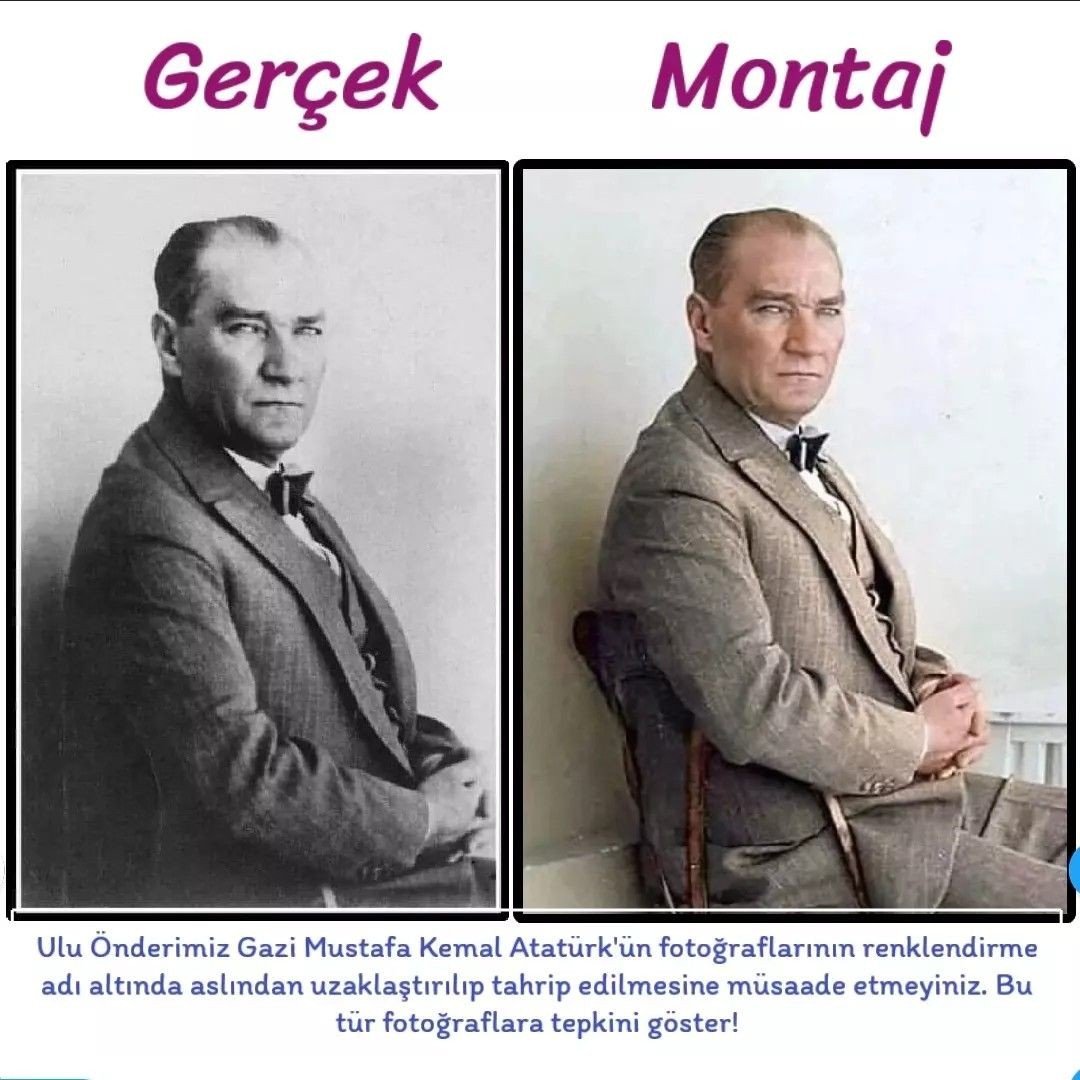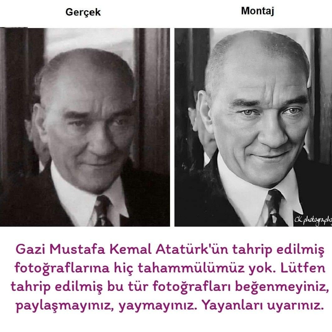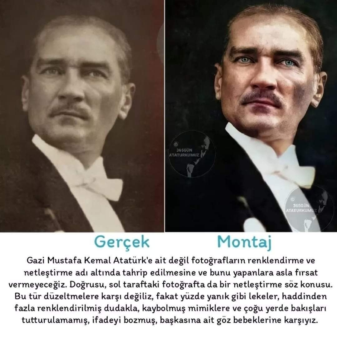 Son zamanlarda Gazi Atatürk’ün fotoğrafları ister restore, tahrip, montaj deyin, ister restorasyon (yenilenme) deyin, ne derseniz deyin, fotoğrafları üstünde büyük bir disiplinli, ince işli, bundan beş, 10, 50 yıl sonraki durum analizli hesaplamalı, sinsi bir çalışmayla orijinalinden uzaklaştırıldığını ve üstünde çalıştıkları fotoğrafların da yok edildiğine şahit oldum/olmaktayım. Tüm bu saptamalarım üzerine Gazi Mustafa Kemal Atatürk’ümüzün fotoğraflarını arşivleyen hesapları kontrol etmeye başladım. Öğrenciğim sonuç o kadar korkunç ki, Gazi Atatürk’ümüze ait fotoğraflar Pinteret’te birkaç tane aynı kişiye ait hesaplardan oluşmakta. Bu kişilerin hesap listesinde Ata’mıza ait nice orijinal fotoğrafları da yer almakta, fakat, bunların şöyle bir yöntemi var. Fotoğrafı netleştiriyor, başkasına ait dudak göz, göz bebeği, kaş, ten, sakal, saç, baş gibi her şeyi değiştirip Gazi Atatürk’ü tanınmaz bir hale sokuyor ve daha sonra fotoğrafın orijinaline ulaşılmaması için onu yok ediyor. Buyurun, ayıklayın pirincin taşını.