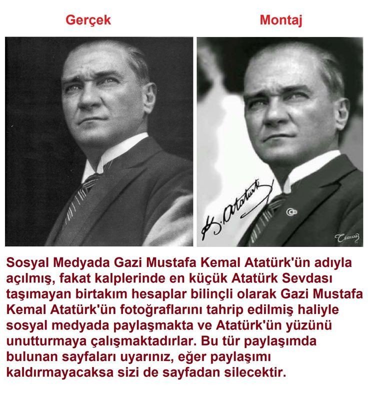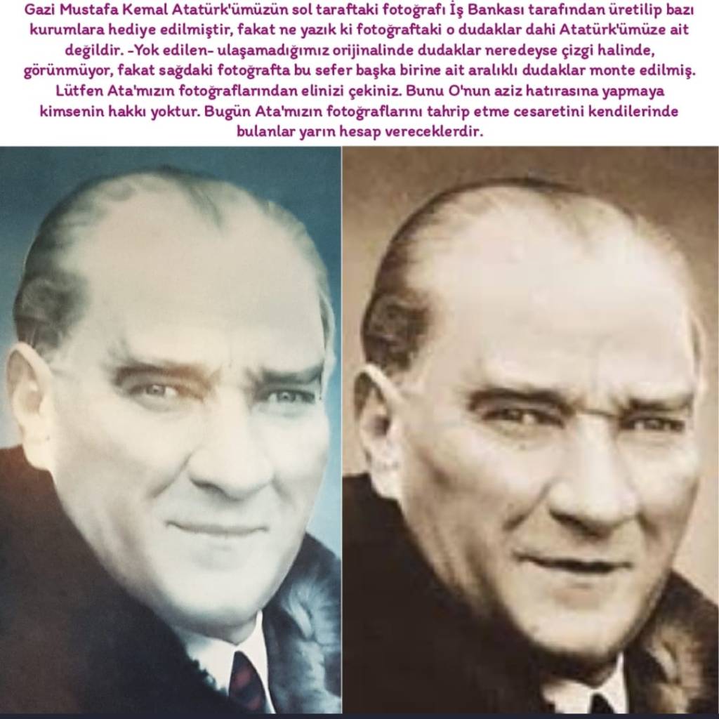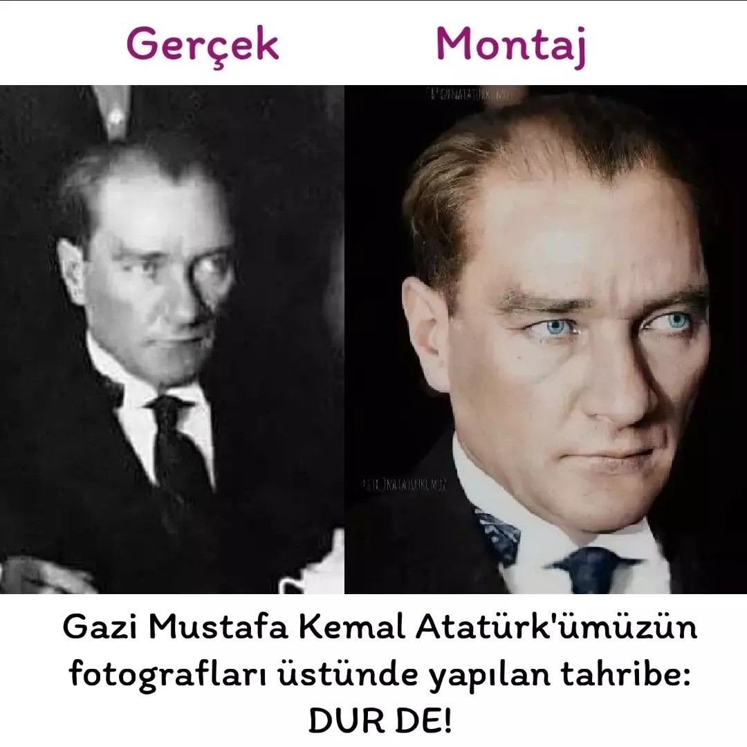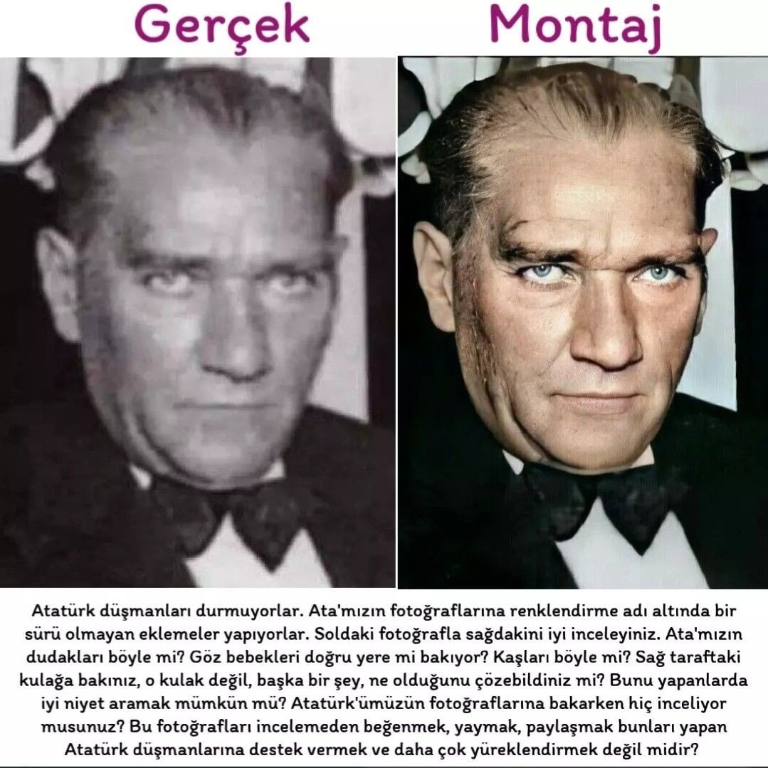 Son zamanlarda Gazi Atatürk’ün fotoğrafları ister restore, tahrip, montaj deyin, ister restorasyon (yenilenme) deyin, ne derseniz deyin, fotoğrafları üstünde büyük bir disiplinli, ince işli, bundan beş, 10, 50 yıl sonraki durum analizli hesaplamalı, sinsi bir çalışmayla orijinalinden uzaklaştırıldığını ve üstünde çalıştıkları fotoğrafların da yok edildiğine şahit oldum/olmaktayım. Tüm bu saptamalarım üzerine Gazi Mustafa Kemal Atatürk’ümüzün fotoğraflarını arşivleyen hesapları kontrol etmeye başladım. Öğrenciğim sonuç o kadar korkunç ki, Gazi Atatürk’ümüze ait fotoğraflar Pinteret’te birkaç tane aynı kişiye ait hesaplardan oluşmakta. Bu kişilerin hesap listesinde Ata’mıza ait nice orijinal fotoğrafları da yer almakta, fakat, bunların şöyle bir yöntemi var. Fotoğrafı netleştiriyor, başkasına ait dudak göz, göz bebeği, kaş, ten, sakal, saç, baş gibi her şeyi değiştirip Gazi Atatürk’ü tanınmaz bir hale sokuyor ve daha sonra fotoğrafın orijinaline ulaşılmaması için onu yok ediyor. Buyurun, ayıklayın pirincin taşını.