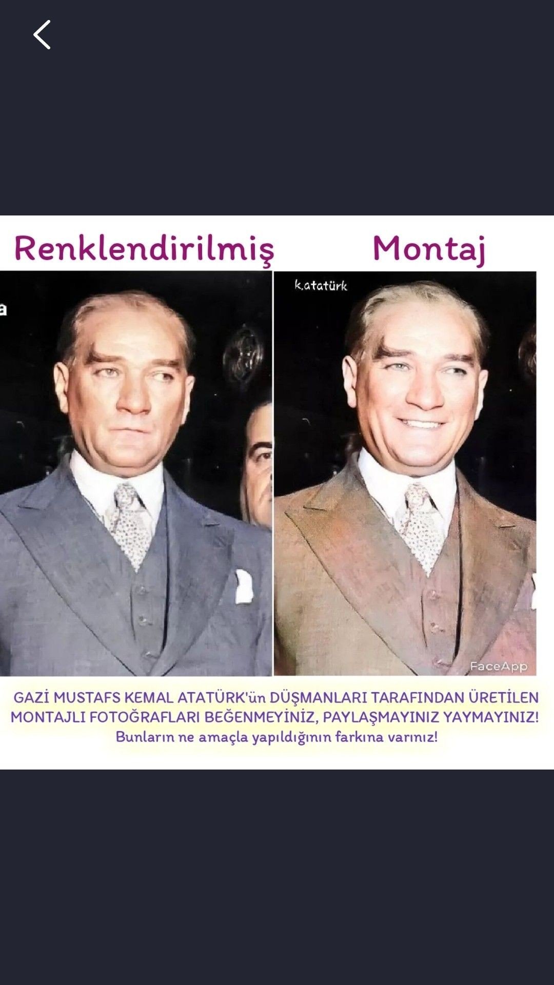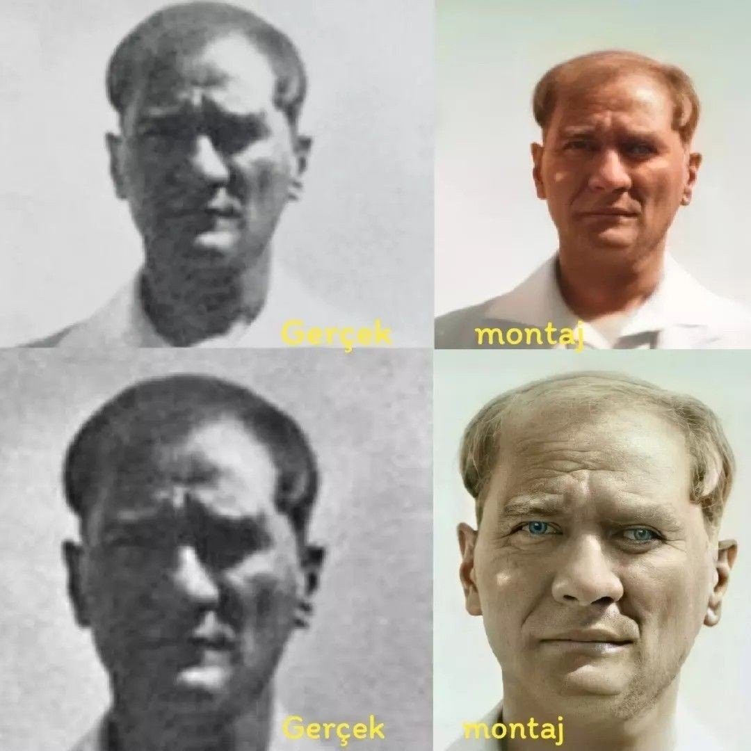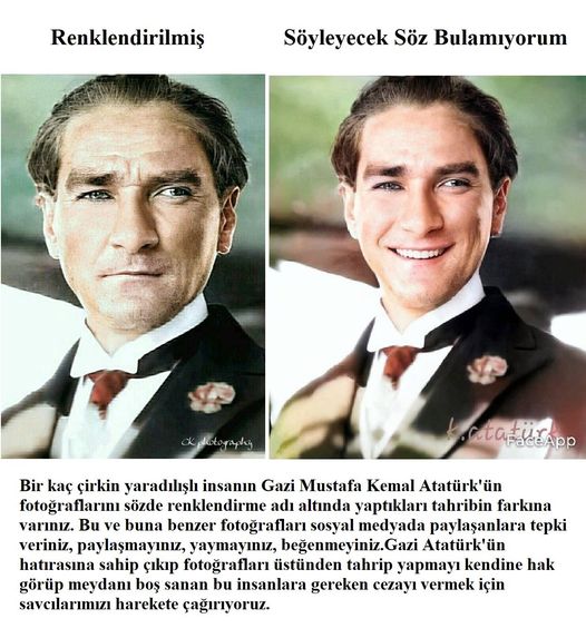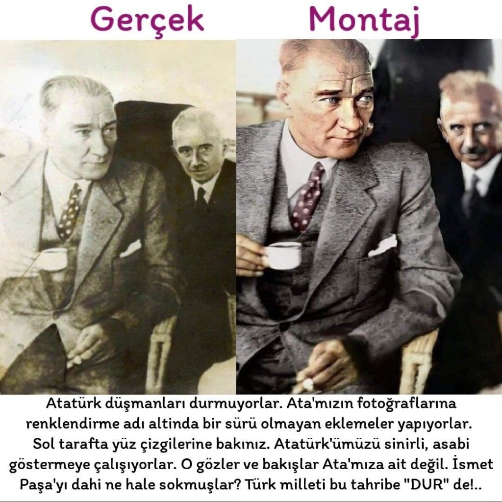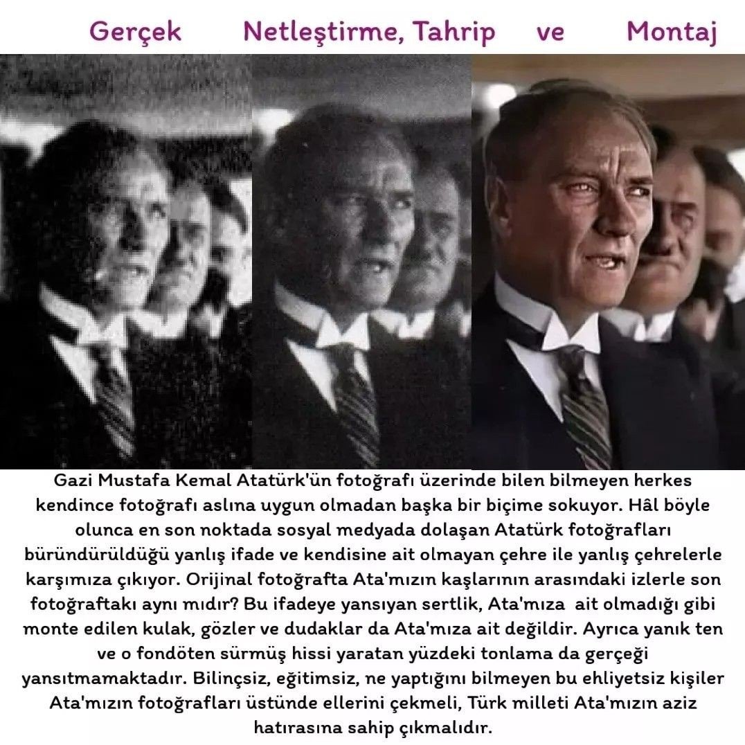Son zamanlarda Gazi Atatürk’ün fotoğrafları ister restore, tahrip, montaj deyin, ister restorasyon (yenilenme) deyin, ne derseniz deyin, fotoğrafları üstünde büyük bir disiplinli, ince işli, bundan beş, 10, 50 yıl sonraki durum analizli hesaplamalı, sinsi bir çalışmayla orijinalinden uzaklaştırıldığını ve üstünde çalıştıkları fotoğrafların da yok edildiğine şahit oldum/olmaktayım. Tüm bu saptamalarım üzerine Gazi Mustafa Kemal Atatürk’ümüzün fotoğraflarını arşivleyen hesapları kontrol etmeye başladım. Öğrenciğim sonuç o kadar korkunç ki, Gazi Atatürk’ümüze ait fotoğraflar Pinteret’te birkaç tane aynı kişiye ait hesaplardan oluşmakta. Bu kişilerin hesap listesinde Ata’mıza ait nice orijinal fotoğrafları da yer almakta, fakat, bunların şöyle bir yöntemi var. Fotoğrafı netleştiriyor, başkasına ait dudak göz, göz bebeği, kaş, ten, sakal, saç, baş gibi her şeyi değiştirip Gazi Atatürk’ü tanınmaz bir hale sokuyor ve daha sonra fotoğrafın orijinaline ulaşılmaması için onu yok ediyor. Buyurun, ayıklayın pirincin taşını.