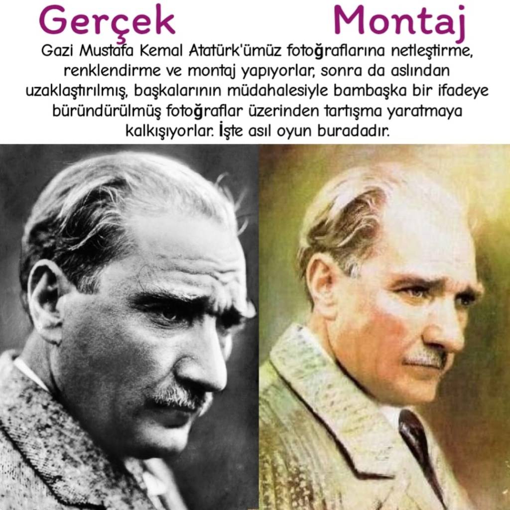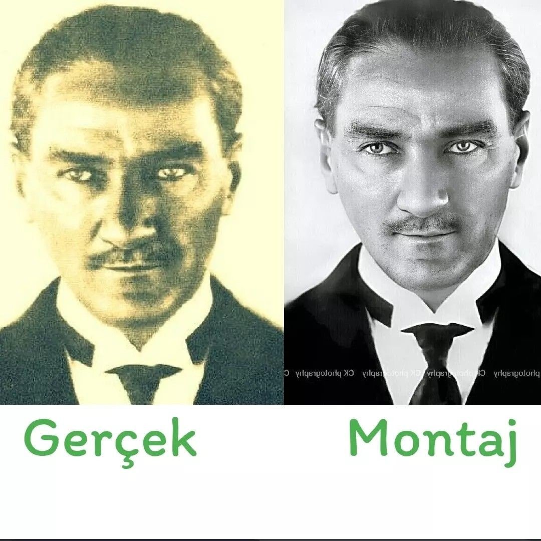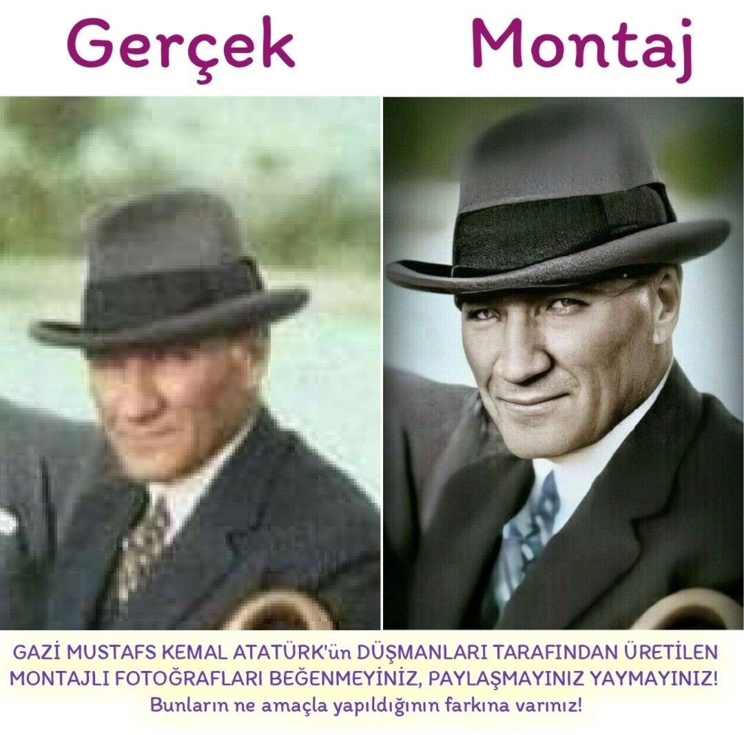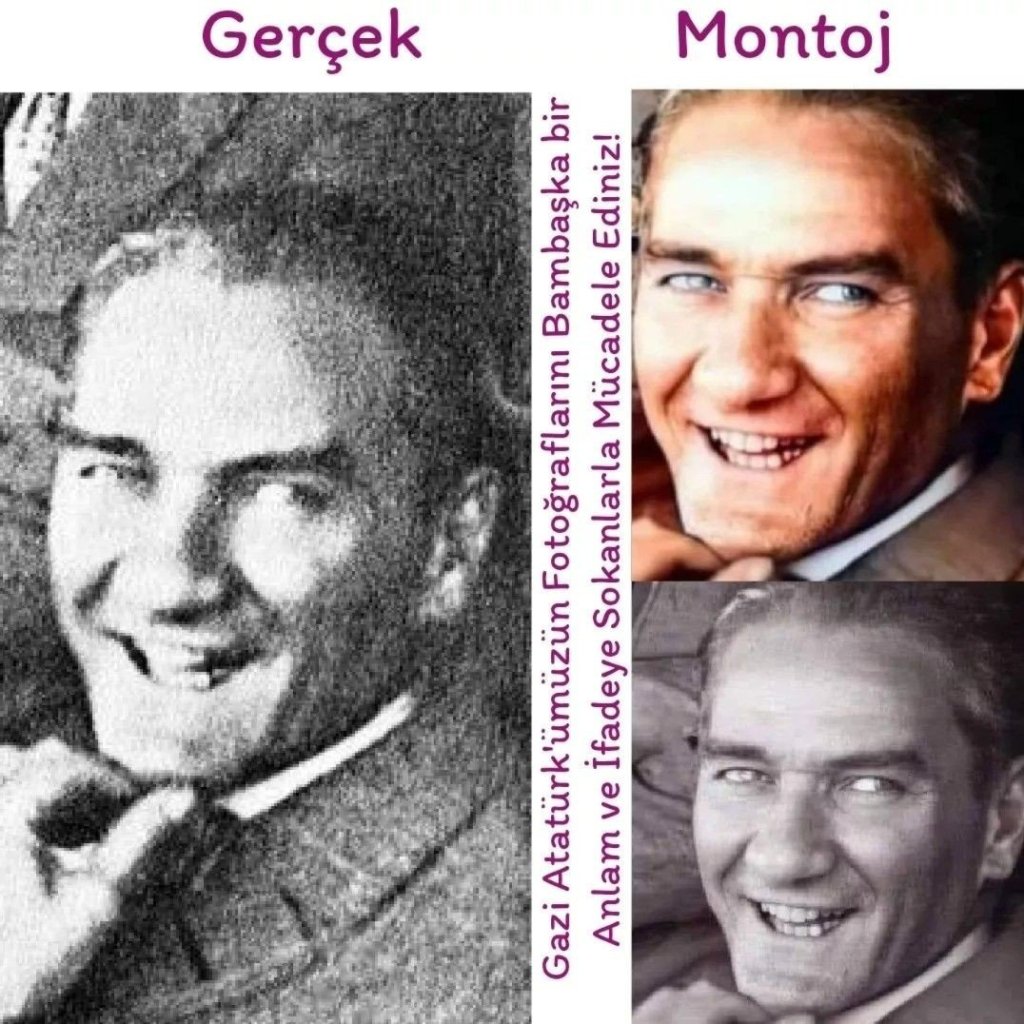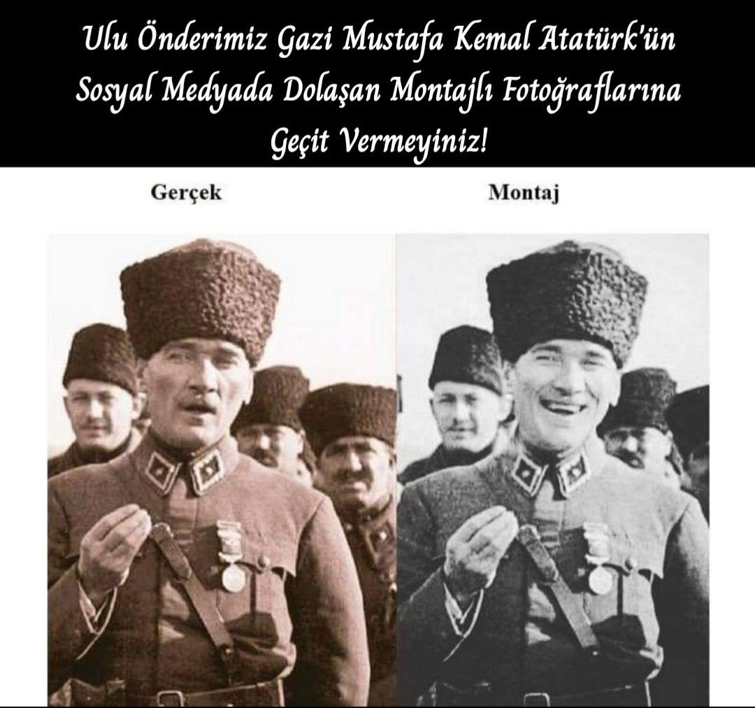 Montaj: Fransızca bir kelimedir ve dilimize oldukça yerleşmiş, sık kullanılır olmuştur. Türk Dil Kurumu’nda, ilk anlamı “kurgu” olan bu kelime ikinci anlamı olarak; “Bir makine, cihaz veya mobilyanın parçalarını yerli yerine takma, monte etme” anlamına gelmekedir. gazi Mustafa kemal Atatürk’ümüzün fotoğraflarında yüzünün neredeyse %90’nını başkalarından alıp onu tanınmaz hale getirerek kendince yüzünü kurgulayan bu kendini bilmezlerin yaptığı işin yerini bulmadığını anlatmak için bu ifadeyi kullanmayı uygun buldum. Zira burada tamamen bunu yapmaya cüret eden kişinin kendine ait bir yüz tasarımı söz konusudur ve ortaya çıkan resim aslından uzaklaştırıldığı gibi, mecazi anlamda bu kötü niyetli kişilerin kendilerinde Gazi Mustafa Kemal Atatürk’ü sosyal medyada yaratacağı algıyı birikesefal çaplarının çıktılarına göre kurgulamaya çalışmaları da buna bir cevap olmuştur. O nedenle, benim bu fotoğrafaları, asıllarının yanında kendi montajları ile paylaşmamı anlayamayacak kadar da cahil olduklarından bunu durumu yourmlamaları zor olmuş olabilir!