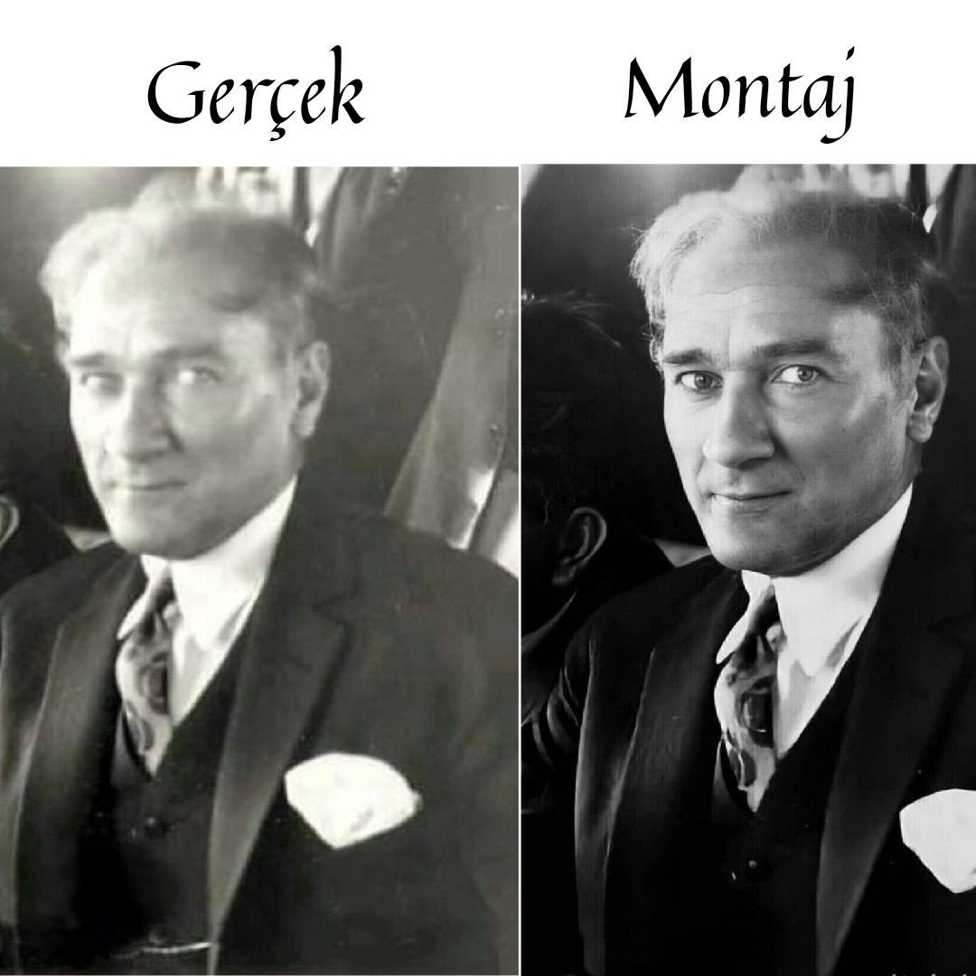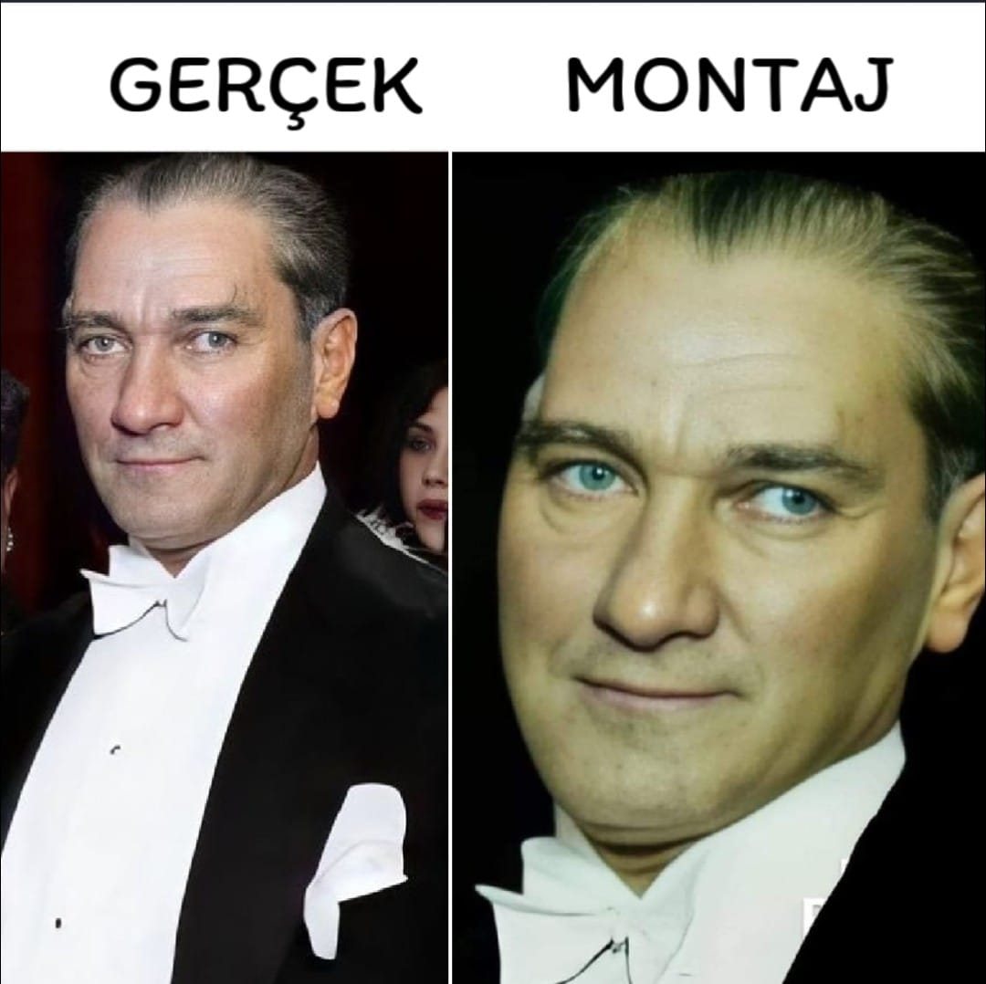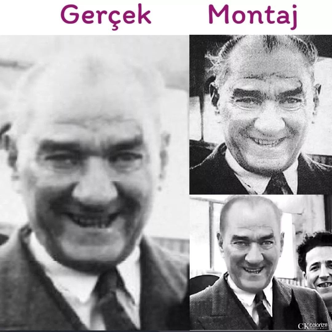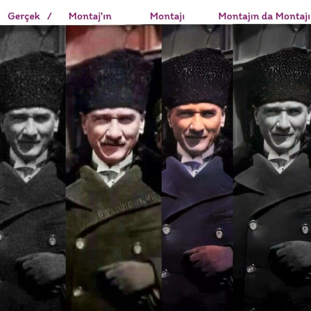 Montaj: Fransızca bir kelimedir ve dilimize oldukça yerleşmiş, sık kullanılır olmuştur. Türk Dil Kurumu’nda, ilk anlamı “kurgu” olan bu kelime ikinci anlamı olarak; “Bir makine, cihaz veya mobilyanın parçalarını yerli yerine takma, monte etme” anlamına gelmekedir. gazi Mustafa kemal Atatürk’ümüzün fotoğraflarında yüzünün neredeyse %90’nını başkalarından alıp onu tanınmaz hale getirerek kendince yüzünü kurgulayan bu kendini bilmezlerin yaptığı işin yerini bulmadığını anlatmak için bu ifadeyi kullanmayı uygun buldum. Zira burada tamamen bunu yapmaya cüret eden kişinin kendine ait bir yüz tasarımı söz konusudur ve ortaya çıkan resim aslından uzaklaştırıldığı gibi, mecazi anlamda bu kötü niyetli kişilerin kendilerinde Gazi Mustafa Kemal Atatürk’ü sosyal medyada yaratacağı algıyı birikesefal çaplarının çıktılarına göre kurgulamaya çalışmaları da buna bir cevap olmuştur. O nedenle, benim bu fotoğrafaları, asıllarının yanında kendi montajları ile paylaşmamı anlayamayacak kadar da cahil olduklarından bunu durumu yourmlamaları zor olmuş olabilir!