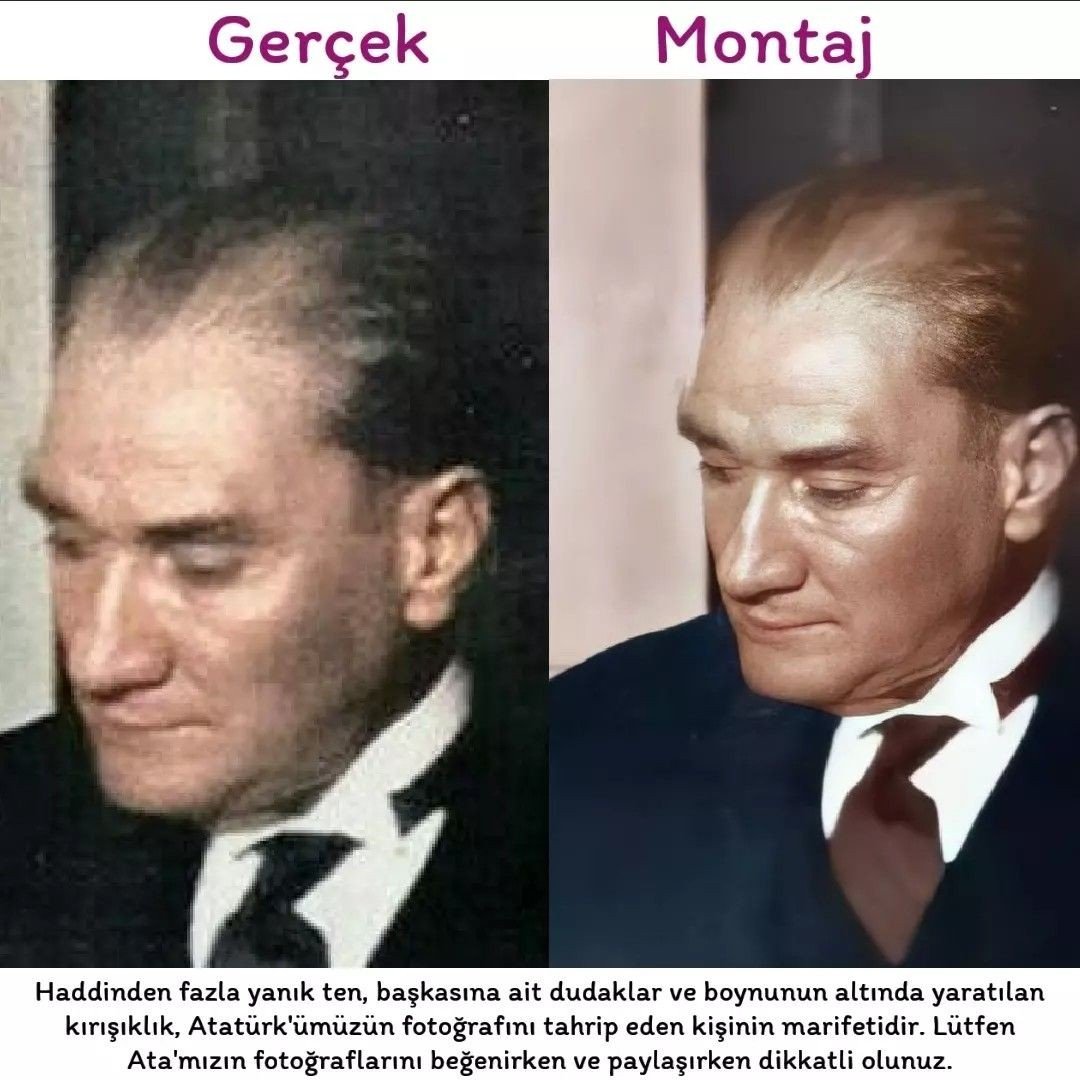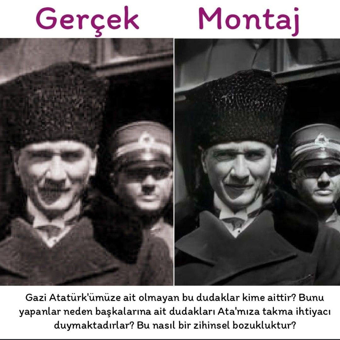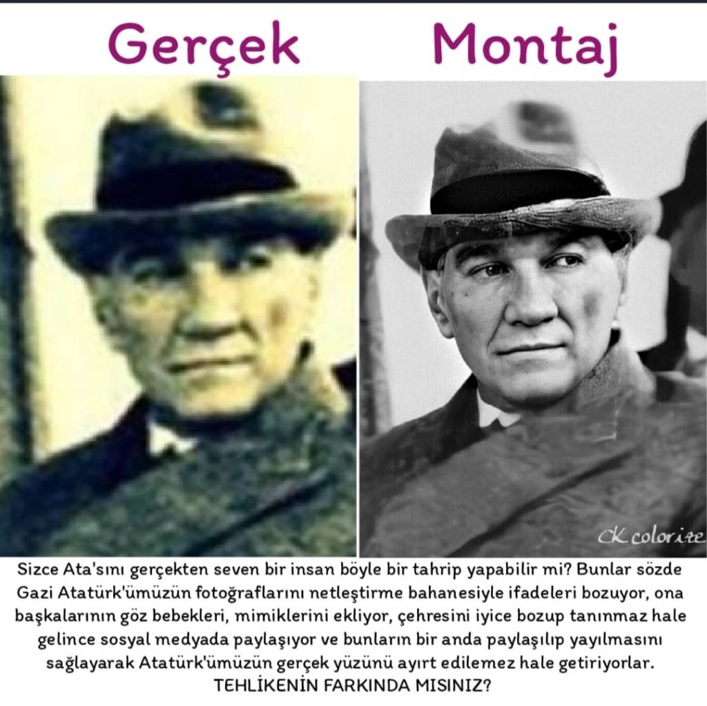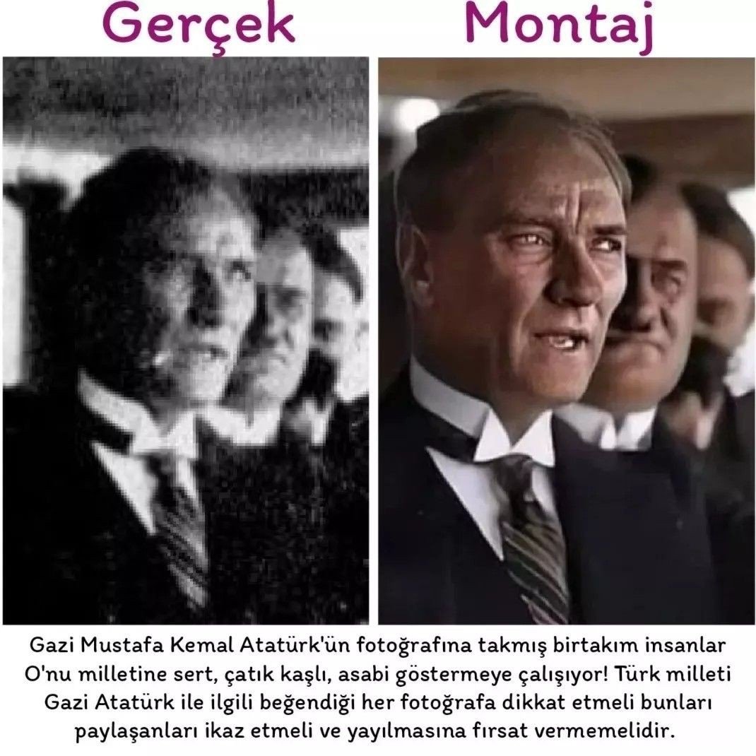 Montaj: Fransızca bir kelimedir ve dilimize oldukça yerleşmiş, sık kullanılır olmuştur. Türk Dil Kurumu’nda, ilk anlamı “kurgu” olan bu kelime ikinci anlamı olarak; “Bir makine, cihaz veya mobilyanın parçalarını yerli yerine takma, monte etme” anlamına gelmekedir. gazi Mustafa kemal Atatürk’ümüzün fotoğraflarında yüzünün neredeyse %90’nını başkalarından alıp onu tanınmaz hale getirerek kendince yüzünü kurgulayan bu kendini bilmezlerin yaptığı işin yerini bulmadığını anlatmak için bu ifadeyi kullanmayı uygun buldum. Zira burada tamamen bunu yapmaya cüret eden kişinin kendine ait bir yüz tasarımı söz konusudur ve ortaya çıkan resim aslından uzaklaştırıldığı gibi, mecazi anlamda bu kötü niyetli kişilerin kendilerinde Gazi Mustafa Kemal Atatürk’ü sosyal medyada yaratacağı algıyı birikesefal çaplarının çıktılarına göre kurgulamaya çalışmaları da buna bir cevap olmuştur. O nedenle, benim bu fotoğrafaları, asıllarının yanında kendi montajları ile paylaşmamı anlayamayacak kadar da cahil olduklarından bunu durumu yourmlamaları zor olmuş olabilir!