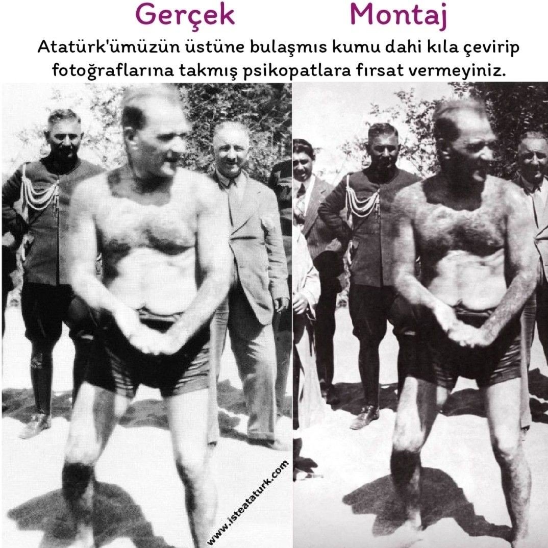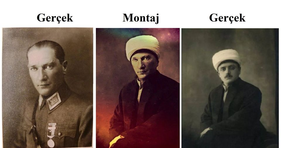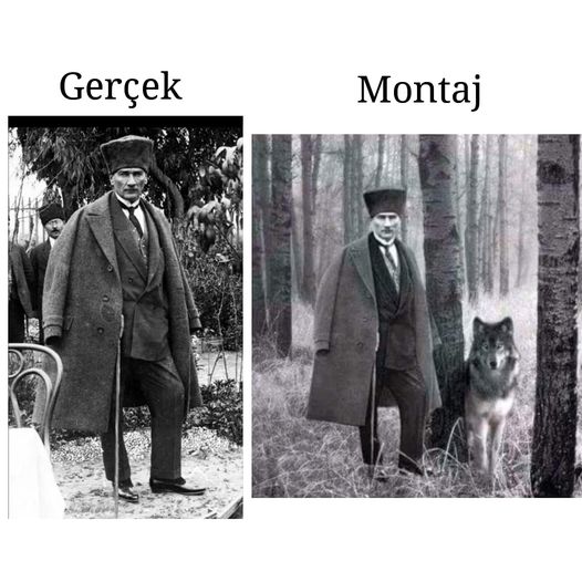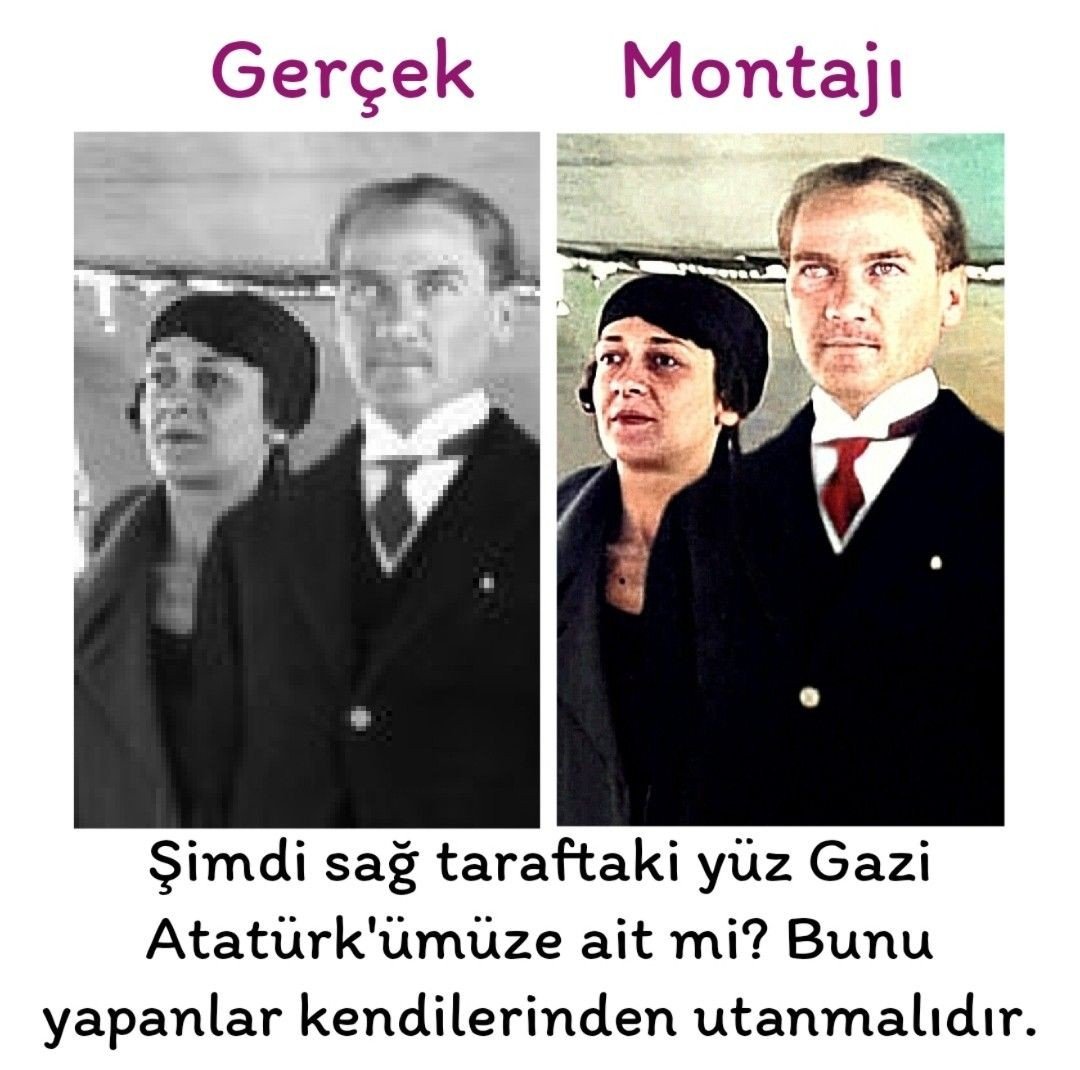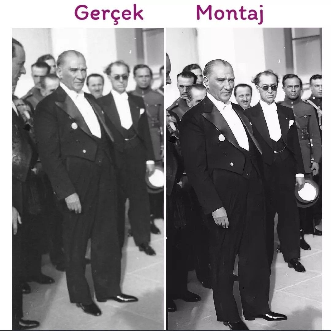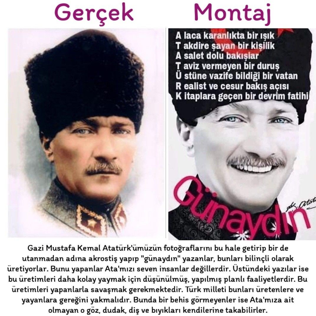 Montaj: Fransızca bir kelimedir ve dilimize oldukça yerleşmiş, sık kullanılır olmuştur. Türk Dil Kurumu’nda, ilk anlamı “kurgu” olan bu kelime ikinci anlamı olarak; “Bir makine, cihaz veya mobilyanın parçalarını yerli yerine takma, monte etme” anlamına gelmekedir. gazi Mustafa kemal Atatürk’ümüzün fotoğraflarında yüzünün neredeyse %90’nını başkalarından alıp onu tanınmaz hale getirerek kendince yüzünü kurgulayan bu kendini bilmezlerin yaptığı işin yerini bulmadığını anlatmak için bu ifadeyi kullanmayı uygun buldum. Zira burada tamamen bunu yapmaya cüret eden kişinin kendine ait bir yüz tasarımı söz konusudur ve ortaya çıkan resim aslından uzaklaştırıldığı gibi, mecazi anlamda bu kötü niyetli kişilerin kendilerinde Gazi Mustafa Kemal Atatürk’ü sosyal medyada yaratacağı algıyı birikesefal çaplarının çıktılarına göre kurgulamaya çalışmaları da buna bir cevap olmuştur. O nedenle, benim bu fotoğrafaları, asıllarının yanında kendi montajları ile paylaşmamı anlayamayacak kadar da cahil olduklarından bunu durumu yourmlamaları zor olmuş olabilir!