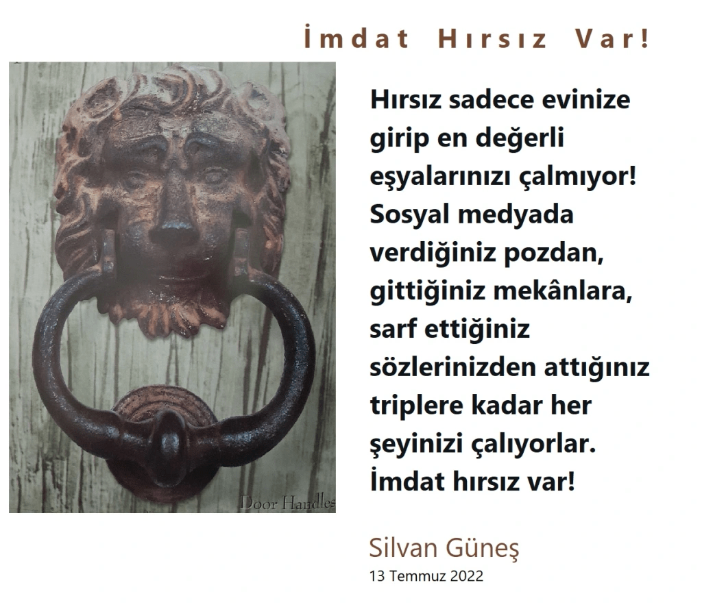 Hırsız sadece evinize girip en değerli eşyalarınızı çalmıyor! Sosyal medyada verdiğiniz pozdan, gittiğiniz mekânlara, sarf ettiğiniz sözlerinizden attığınız triplere kadar her şeyinizi çalıyorlar. Ben twitter’da nice vecizelerimi çaldırdım mesela! Kendinize ait sözlerin, düşüncelerin bir benzerini üreterek paylaşıldığını görünce, -daha doğrusu kendinize ait bir sözü bir başkası söylemişçesine paylaşıp, altında yazılmış yorumları da okudukça haliyle içiniz bir yanıyor ve; “İmdat hırsız var!” diye bağırmamak için kendinizi zor tutuyorsunuz!