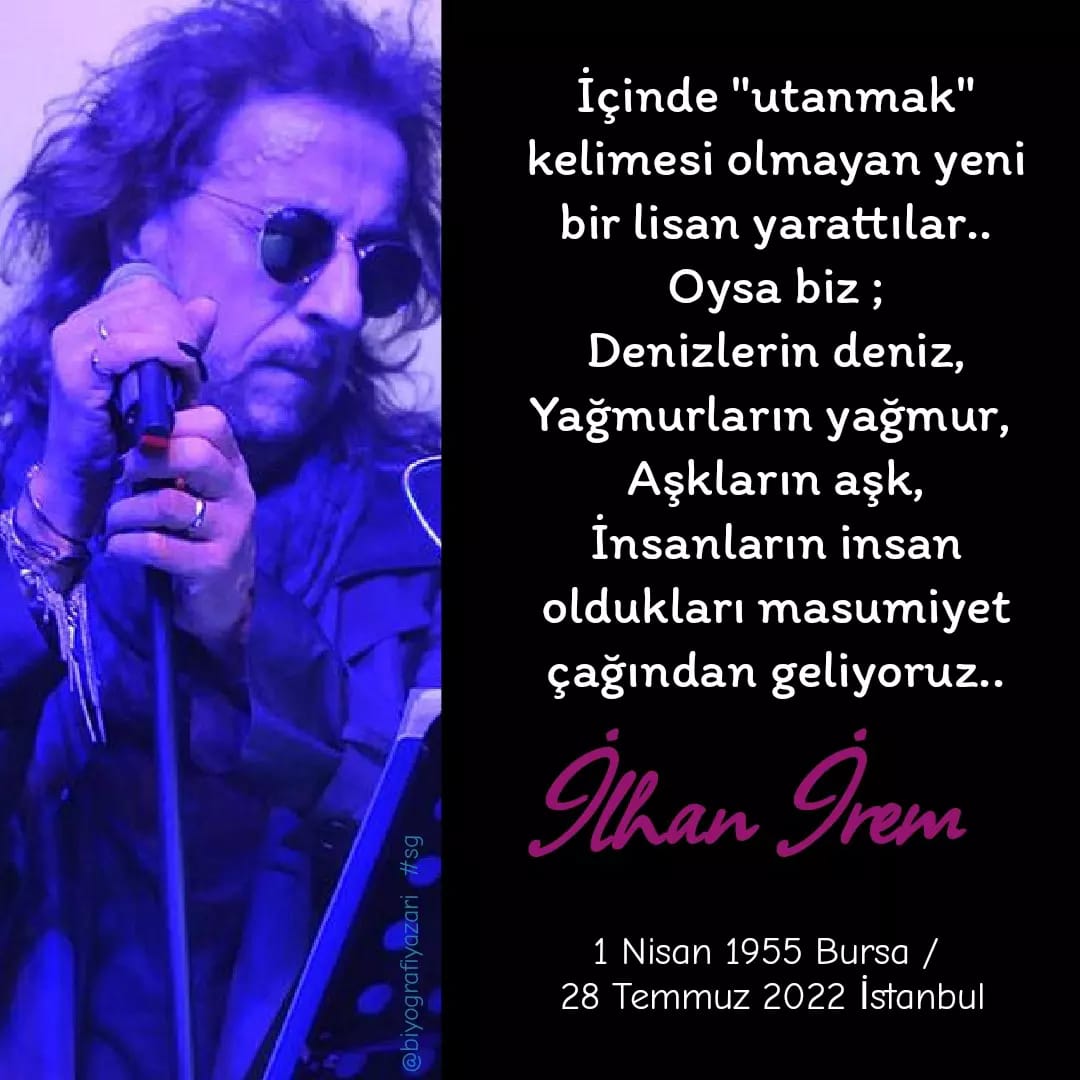 Sevgili İlhan İrem’i sevenleri olarak kırık, dökük içinde kalmış ve bu halimizle kendimizi dahi suçlu hissettiğimiz tarifsiz bir halimiz var. 1 Nisan 1955 yılında Bursa’da dünyaya gelip, 28 Temmuz 2022’de geçirdiği böbrek rahatsızlığı yüzünden hayatını henüz 67 yaşında kaybeden ve ve son yirmi yıl boyunca neredeyse sanatını icra dahi edemeden aramızdan ayrılan sanatçımızı bu şekilde uğurladığımız için hepimize isyanım var.
