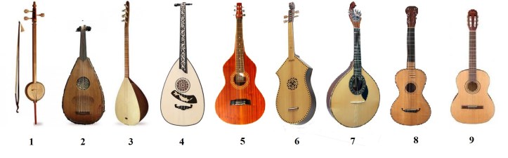 Tarihi süreç içerisinde enstrümanlar sırayla şöyle dizilebilir; 1) Rebap (aynı zamanda kabak kemane ve kemençenin de atasıdır. 2) Kopuz, 3) Bağlama (Saz), 4) Türk Lavtası (ud’un atası, perdesiz çalgı), 5) Mağrip (Latin, geleneksel sazı), 6) Mandola (Latin geleneksel çalgısı), 7) Portuguese gitarı (Latin geleneksel çalgısı), 8) Türklerin topuzunun klasik gitar görünümlü hali. Topuz gibi perdesiz saz. , 9) Klasik gitar.