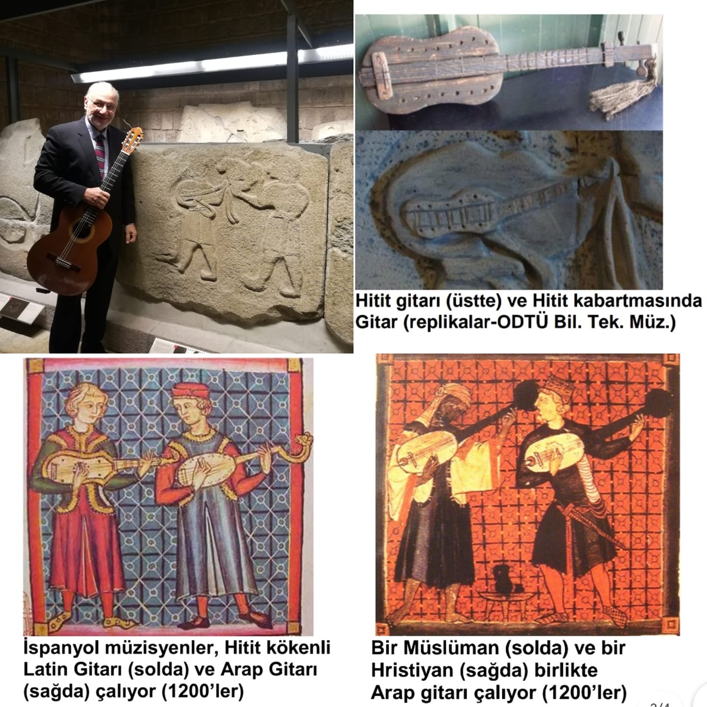 İşte bu tarihi gelişim içerisinde gitarı değerlendirdiğimizde Hitit’in başkenti Hattuşaş’ın 25. km kuzeydoğusunda bulunan ve Anadolu ile ilgili en ünlü simgelere ev sahipliği yapan “Alacahöyük” olarak biline höyükte, 1935 yılında Türk Tarih Kurumu ilk kazı çalışmalarını gerçekleştirmiş, Atatürk’ün Türk Tarih Tezi’nin gündemde olduğu bir dönemde Hititlerin tarihi araştırılmış, ve gerçekten kazılar ilerledikçe şaşırtıcı bir şekilde Tunç Çağı’na ait (M.Ö. 3200-2000) yıllarına ait köklü bir kültürün izleri ortaya çıkmıştır. İşte o kazılarda ortaya çıkan ve Hitit tarihi konusunda önemli bilgilere ulaşmamıza vesile olan kazılar bizleri Hitit müzik kültürü hakkında aydınlatmıştır. Yukarıda gördüğünüz rölyefte müzisyenlerin yer aldığı bir kurban töreni yer almakta, icracısının elinde tellerini çalmak için pena/mızraba benzeyen bir gereçle bu gerece bağlı bir ip olduğu görülmektedir. Gövdesine dayayarak çaldığı saplı bir lut çalgısının formu ise bugünkü gitarla tamamen benzerlik göstermektedir. Türklerin Anadolu’ya resmi olarak girdileri 1071 Malazgirt Savaşı galibiyeti ile başlayan yoğun göçlerden çok daha önce, yaklaşık 1000 yıl önce iki telli, tezene ile çalınan, orta uzunluktaki kolu üzerinde perdeleri olan, sapından püskülüne kadar bugünkü saza çok benzeyen bir çalgının Mezopotamya ve Anadolu’da yaygın olduğu ve aynı çalgının Hitit duvar kabartmalarında ve sanatsal eserlerinin üstünde de görüldüğü artık biliniyor.