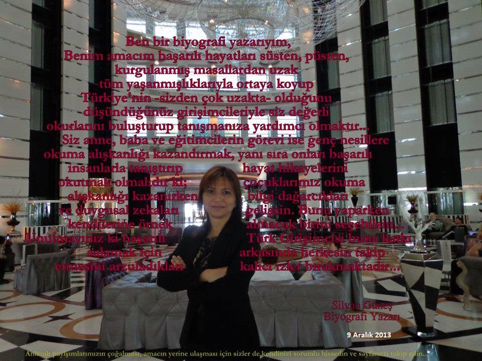 Ben bir biyografi yazarıyım. Benim amacım başarılı hayatları süsten, püsten, kurgulanmış masallardan uzak tüm yaşanmışlıklarıyla ortaya koyup, Türkiye’nin -sizden çok uzakta olduğunu düşündüğünüz- girişimcileriyle siz değerli okurlarını buluşturup tanışmanıza yardımcı olmaktır. Siz anne, baba ve eğitimcilerin görevi ise genç nesillere okuma alıkşanlığı kazandırmak, yanı sıra onları başarılı insanlarla tanıştırıp hayat hikâyelerini okutmak olduğundandır ki; çocuklarımız alışkanlığı kazanırken bilgi dağarcıkları ve duygusal zekâlarını gelişsin. Bunu yaparken kendilerine örnek alınacak, birini seçebilsin! Unutmayınız ki başarılı Türk Girişimcisi buna katkı sağlamak için arkasında herkesin takip etmesini arzuladıkları kalıcı izler bırakmaktadır…
