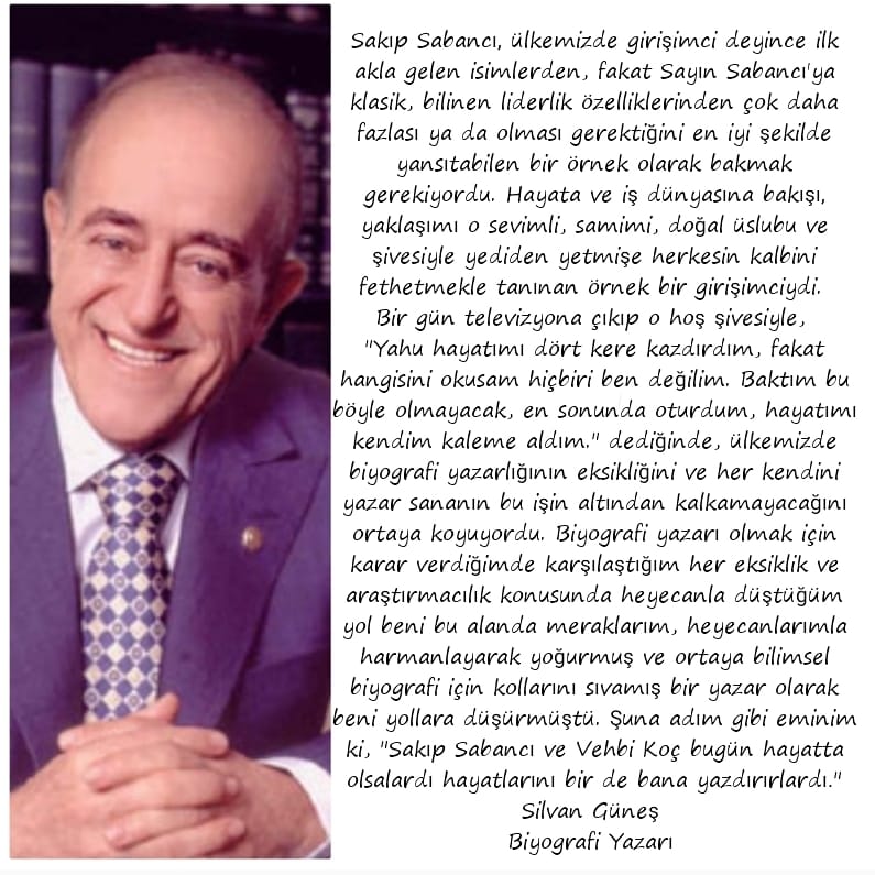 Merhuım Sakıp Sabancı, girişimci deyince ilk akla gelen isimlerden, fakat Sayın Sabancı’ya klasik, bilinen liderlik özelliklerinden çok daha fazlası ya da olması gerektiğini en iyi şekilde yansıtabilen bir örnek olarak bakmak gerekiyordu. Hayata ve iş dünyasına bakışı, yaklaşımı ve o sevimli, samimi, doğal üslubu ve şivesiyle yediden yetmişe herkesin kalbini fethetmekle tanınan örnek bir girişimciydi. Bir gün televizyon kanalından birine çıkıp o hoş şivesiyle, “Yahu hayatımı dör kere yazdırdım, fakat hangisini okuduysam hiçbiri ben değilim! Baktım bu böyle olmayacak, en sonunda oturdum hayatımı kendim kaleme aldım.” dediğinde, ülkemizde biyografi yazarlığının eksikliğini ve her kendini yazar sananın bu işin altından kalkamayacağını ortaya koyuyordu. Biyografi yazarı olmak için karar verdiğimde karşılaştığım her eksiklik ve araştırmacılık konusunda heyecanla düştüğüm yol, beni bulanda bu alanda meraklaım, heyecanlarımla harmanlanarak yoğurmuş ve ortaya bilimsel biyografi için kolları sıvamış bir yazar olarak beni yollara düşürmüştü. Şuna adım gibi eminim ki merhum ” Sakıp Sabancı ve Vehbi Koç bugün hayatta olsalardı hayatlarını bir de bana yazdırırlardı.