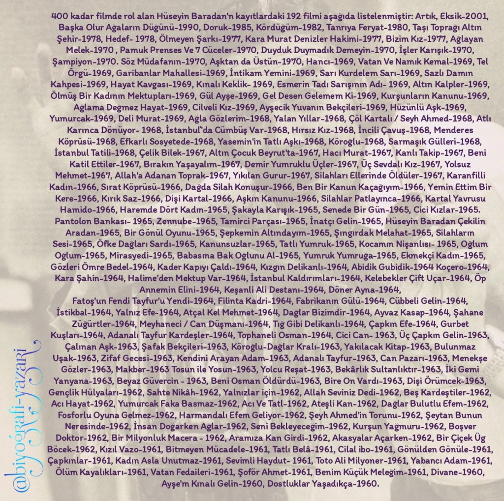 15 Haziran 1932 doğumlu olduğuna göre, o daha kundakta bebekken Gazi Atatürk’ümüz Hüseyin ve Hüseyin gibi nice Türk çocuklarının geleceğini en iyi şekilde tayin etmek için savaştan çıkmış bir milleti muasır medeniyetler seviyesine eriştirmek için yaptığı devrimleri hayata geçirmeye çalışıyor, açtığı fabrikalarda üretimi ve istihdamı aynı paralelde ilerleyişini sağlarken eğitimden sağlığa nice alanlarda başka bir savaş veriyordu. Gazi Atatürk’ümüz 10 Kasım 1938’de hayata gözlerini yumruğunda, #HüseyinAvniBaradan beş yaşında beş aylıkmış! Yine de Atatürk’ümüz hayattayken yaşıyor olması ve yaşarken bunun için dahi övünç duymak ne büyük şans! #HüseyinBaradan gibi değerli sanatçılarımız yokluğun ne olduğunu bilen, ülkelerinin kalkınması için seçtikleri yolda kendi adlarına çalışan, kalpleri memleket, millet aşkıyla dolu güzel insanlardı. Onları anmak, yaşarken yad etmek ve gelecek nesillere miraslarını aktarırken isimlerini yaşatmak ise bizlere düşüyor. Umarım her Türk, kendi topraklarının ezasını da cefasını da çekmiş insanına gereken değeri vermek konusundaki hassasiyetinden ödün vermeden yaşar! Hüseyin Baradan’ı büyük bir şükran ve özlemle anıyoruz!