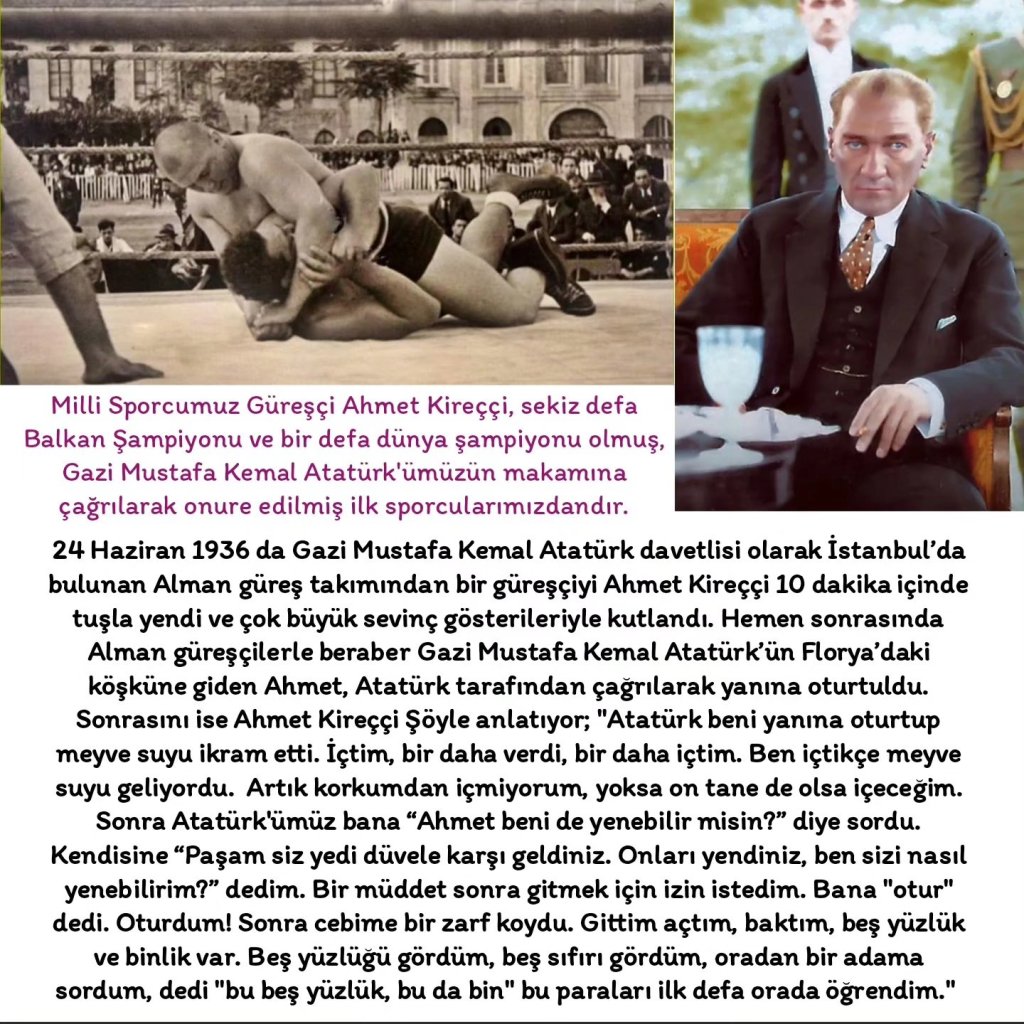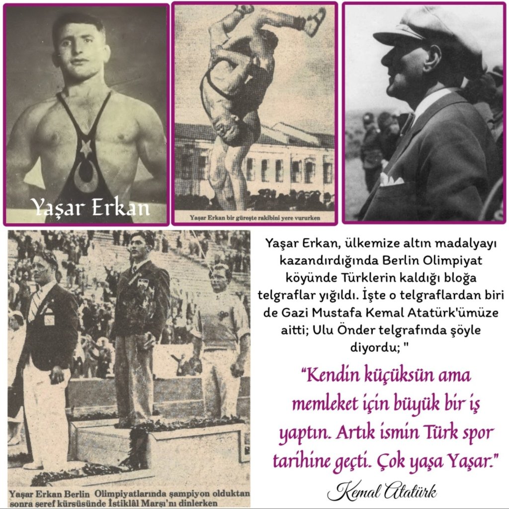 Olimpiyat tarihimizin ilk özel ismi olmayı galibiyetleriyle hak eden ve ülkemizi başarılarıyla taçlandıran Milli Sporcularımız Güreşçi Yaşar Erkan ve Ahmet Kireççi, Gazi Mustafa Kemal Atatürk’ümüzün takdirini kazanmış ve her ikisi de hak ettikleri taltifi, övüncü hem resmi kanallardan hem de Türk Milleti’nden gereğince almışlardır. Öyle ki, bir insanı birey yapan en temel unsur; yaşadığı topraklarda seçtiği alanda ilerleyip kendini başarılı kılmaktır. Sonrasında o başarının ölcüsünü en ulaşılmaz seviyeye çıkarttıkça, bu sefer bunu milletine de mâl ederek onu yüceltmesi, elbette her milletin vatandaşlarından arzu ettiği bu ödülün sevinciyle kendinden, ülkesinden, vatandaşlarından gurur duyması ve onu sahiplenmesidir. İşte bu duygu bir milleti millet yapan en büyük unsurlardan biridir. Bir millet, sadece savaşta değil, hayatta yaşarken de kendi ırkından bir vatandaşın gösterdiği başarıya saygı duyar, mutlu olur, ayakta alkışlar, ve zaten bu duyguları yaşamıyorsa, o kişi o ülkenin vatandaşı olsa dahi, kesinlikle ona mensup biri değildir. Dolayısıyla bu ülkede hangi alanda olursa olsun, milli bir başarı elde etmiş her fert, layık olduğu gibi anılmalı, taktir edilmeli, ödüllendirilmeli, her fırsatta alkışlamalı ve sahip olduğu başarı genç nesillere özendirilerek, onların da o yolda ilerlemelerini sağlayacak şekilde, uygulamalı bir eğitimle temeli güçlendirilmelidir. Dolayısıyla hangi alanda olursa olsun o iş’e/dal’a alternatifleriyle birlikte ortam sağlanması için gerekli olan maddi-manevi yatırımların yapılması, konuyu laf sözden çıkartıp olması gereken icraatla buluşturması ancak bizleri bir yola düşürüp ilerletebilecektir. İşte onlardan iki önemli isim olan Yaşar Erkan ve Ahmet Kireççi, yıllarca ülkemizi Ata Sporu olarak bildiğimiz güreşte çok iyi noktalara getirmişler ve atletizmde bir miladın başlamasına vesile olmuşlardır. Her iki sporcumuzun da Atatürk’ümüz tarafından takdir ve tatlif edilmesinin yanı sıra Ata’mızın her alanda Türk sporcuların yetişmesi için verdiği çabalar, cumhuriyetimizin 100. yılına girdiğimiz şu günlerde ancak meyvelerini vermektedir!