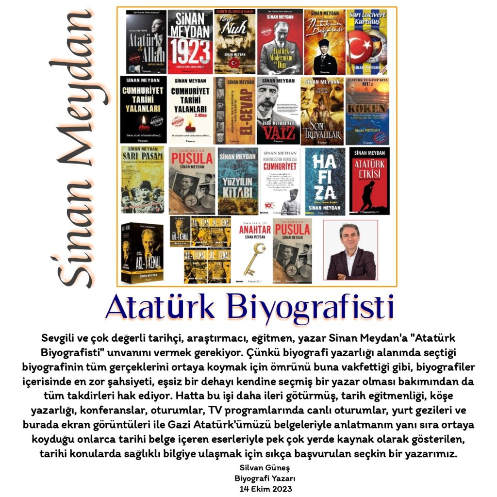 Sevgili ve çok değerli tarihçi, araştırmacı, eğitmen, yazar Sinan Meydan’a “Atatürk Biyografisti” unvanını vermek gerekiyor. Çünkü biyografi yazarlığı alanında seçtiği biyografinin tüm gerçeklerini ortaya koymak için ömrünü buna vakfettiği gibi, biyografiler içerisinde en zor şahsiyeti, eşsiz bir dehayı kendine seçmiş bir yazar olması bakımından da tüm takdirleri hak ediyor. Hatta bu işi daha ileri götürmüş, tarih eğitmenliği, köşe yazarlığı, konferanslar, oturumlar, TV programlarında canlı oturumlar, yurt gezileri ve burada ekran görüntüleri ile Gazi Atatürk’ümüzü belgeleriyle anlatmanın yanı sıra ortaya koyduğu onlarca tarihi belge içeren eserleriyle pek çok yerde kaynak olarak gösterilen, tarihi konularda sağlıklı bilgiye ulaşmak için sıkça başvurulan seçkin bir yazarımız.