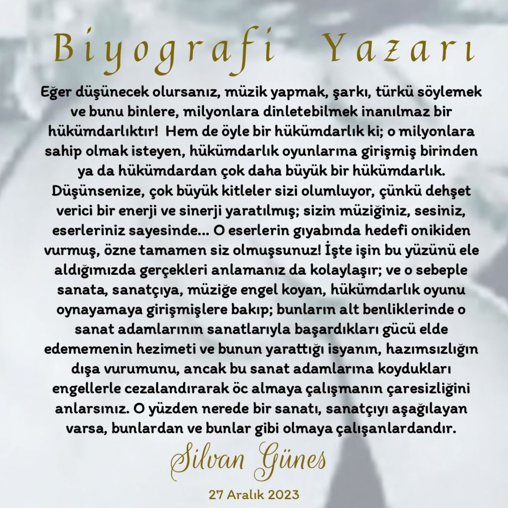 Eğer düşünecek olursanız, müzik yapmak, şarkı, türkü söylemek ve bunu binlere, milyonlara dinletebilmek inanılmaz bir hükümdarlıktır! Hem de öyle bir hükümdarlık ki; o milyonlara sahip olmak isteyen, hükümdarlık oyunlarına girişmiş birinden ya da hükümdardan çok daha büyük bir hükümdarlık. Düşünsenize, çok büyük kitleler sizi olumluyor, çünkü dehşet verici bir enerji ve sinerji yaratılmış; sizin müziğiniz, sesiniz, eserleriniz sayesinde… O eserlerin gıyabında hedefi onikiden vurmuş, özne tamamen siz olmuşsunuz! İşte işin bu yüzünü ele aldığımızda gerçekleri anlamanız da kolaylaşır; ve o sebeple sanata, sanatçıya, müziğe engel koyan, hükümdarlık oyunu oynayamaya girişmişlere bakıp; bunların alt benliklerinde o sanat adamlarının sanatlarıyla başardıkları gücü elde edememenin hezimeti ve yenilginin dışa vurumunu, ancak bu sanat adamlarına koydukları engellerle cezalandırarak öc almaya çalışmanın çaresizliğini anlarsınız. O yüzden nerede bir sanatı, sanatçıyı aşağılayan varsa, bunlardan ve bunlar gibi olmaya çalışanlardandır.