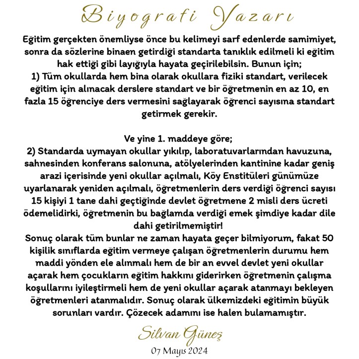 Sonuç olarak; ülkemizdeki eğitimin çok büyük sorunları vardır. Çözecek adamını ise halen bulamamıştır. O sebeple yukarıda yazdıklarımı kim ne zaman hayata geçireceğini bilmiyor olsak da burada kaleme aldığım her bir cümlenin hayata geçirilememesi mümkün dahi değildir, yeter ki, iktidara sahip olanlar ülkenin elinden aldıklarını yeniden geri verebilsinler! 50 kişilik sınıflarda eğitim vermeye çalışan öğretmenlerin durumu hem maddi yönden ele alınmalı hem de bir an evvel devlet yeni okullar açarak çocukların eğitim hakkını gasp etmemelidir. Şu an 99.000 öğretmen ‘Sözleşmeli Öğretmen’ adı altında çalıştırılmaktadır. Bu öğretmenler ivedilikle kadroya alınmalı, liyakate ise önem verilmelidir. Öğretmenin çalışma koşullarını iyileştirilmeli, yeni okullar açılmalı, açılacak okullara ivedilikle atanmayı bekleyen öğretmenler meslekleriyle buluşarak istihdam edilmelidir.