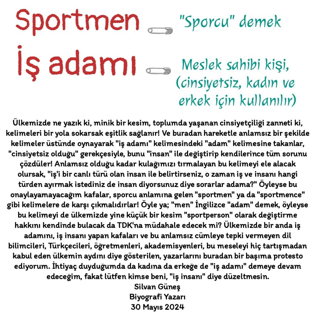 Ülkemizde ne yazık ki, minik bir kesim, toplumda yaşanan cinsiyetçiliği zanneti ki, kelimeleri bir yola sokarsak eşitlik sağlanır! Ve buradan hareketle anlamsız bir şekilde kelimeler üstünde oynayarak “iş adamı” kelimesindeki “adam” kelimesine takanlar, “cinsiyetsiz olduğu” gerekçesiyle, bunu #insan ile değiştirip kendilerince tüm sorunu çözdüler! Anlamsız olduğu kadar kulağımızı tırmalayan bu kelimeyi ele alacak olursak, “iş’i bir canlı türü olan insan ile belirtirseniz, o zaman iş ve insanı hangi türden ayırmak istediniz de insan diyorsunuz diye sorarlar adama?” Öyleyse bu onaylayamayacağım kafalar, sporcu anlamına gelen #sportmen ya da “sportmence” gibi kelimelere de karşı çıkmalıdırlar! Öyle ya; #men #İngilizce #adam demek, öyleyse bu kelimeyi de ülkemizde yine küçük bir kesim “sportperson” olarak değiştirme hakkını kendinde bulacak da TDK’na müdahale edecek mi? Ülkemizde bir anda iş adamını, iş insanı yapan kafaları ve bu anlamsız cümleye tepki vermeyen dil bilimcileri, Türkçecileri, öğretmenleri, akademisyenleri, bu meseleyi hiç tartışmadan kabul eden ülkemin aydını diye gösterilen, yazarlarını buradan bir başıma protesto ediyorum. İhtiyaç duyduğumda da kadına da erkeğe de “iş adamı” demeye devam edeceğim, fakat lütfen kimse beni, #işinsanı diye düzeltmesin.
