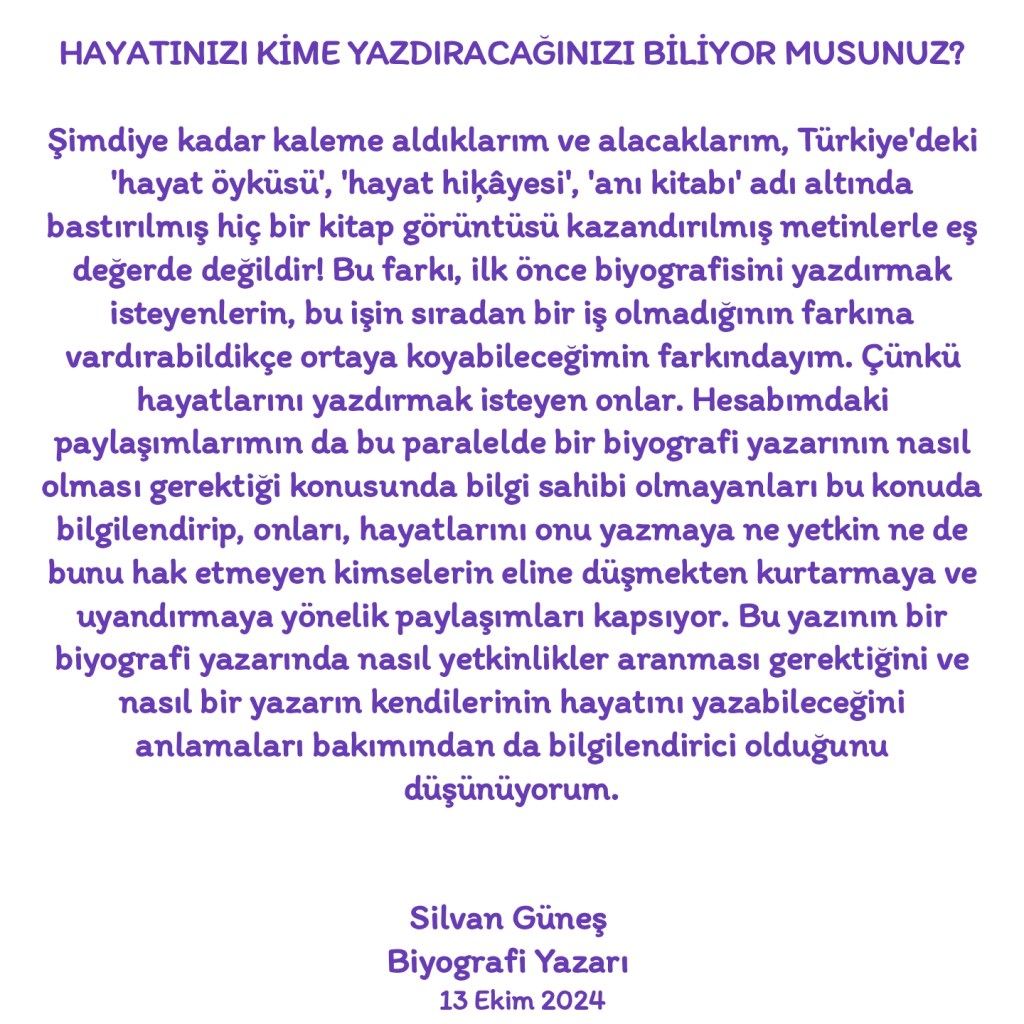 Hayat hikâyesini yazdıranlarla ilgili kast edilen ve içi masaldan başka bir şey olmayan, bir girişimciyi, sanatçıyı, siyasetçiyi, edebiyatçıyı, mucidi gerçek anlamda tanımamıza, yaptığı işi tüm boyutlarıyla ortaya koyup kendini nasıl gerçekleştirdiğine, ana hedefe ulaşmak için hedeflerine ve bir hayatta sorgulanması gereken nice başlıklara hiç değinilmeden yazılan ve tam aksine hayatını yazdıranı süslü kelimelerle göklere çıkarttıkça yere batıran, birçok soruyu cevapsız bırakan vb bu algı ya da tarzdan kendimi ayırmak için, yaptığım işe Fransızca’dan dilimize geçmiş “biyografi yazarı” demek zorunda kaldım. Çünkü ne yazık ki ülkemizde yapılan hatayı insanların gözünün içine sokamadığınız müddetçe ne yaptığınız iş ne de sizin varlığınız, bu alandaki tekliğiniz anlaşılamıyor. O sebeple şimdiye kadar kaleme aldıklarım ve alacaklarım, Türkiye’deki ‘hayat öyküsü’, ‘hayat hiķâyesi’, ‘anı kitabı’ adı altında bastırılmış hiç bir kitap görüntüsü kazandırılmış metinlerle eş değerde değildir! Bu farkı, ilk önce biyografisini yazdırmak isteyenlerin, bu işin sıradan bir iş olmadığının farkına vardırabildikçe ortaya koyabileceğimin farkındayım. Çünkü hayatlarını yazdırmak isteyen onlar. Hesabımdaki paylaşımlarımın da bu paralelde bir biyografi yazarının nasıl olması gerektiği konusunda bilgi sahibi olmayanları bu konuda bilgilendirip, onları, hayatlarını onu yazmaya ne yetkin ne de bunu hak etmeyen kimselerin eline düşmekten kurtarmaya ve uyandırmaya yönelik paylaşımları kapsıyor. Bu yazının bir biyografi yazarında nasıl yetkinlikler aranması gerektiğini ve nasıl bir yazarın kendilerinin hayatını yazabileceğini anlamaları bakımından da bilgilendirici olduğunu düşünüyorum.