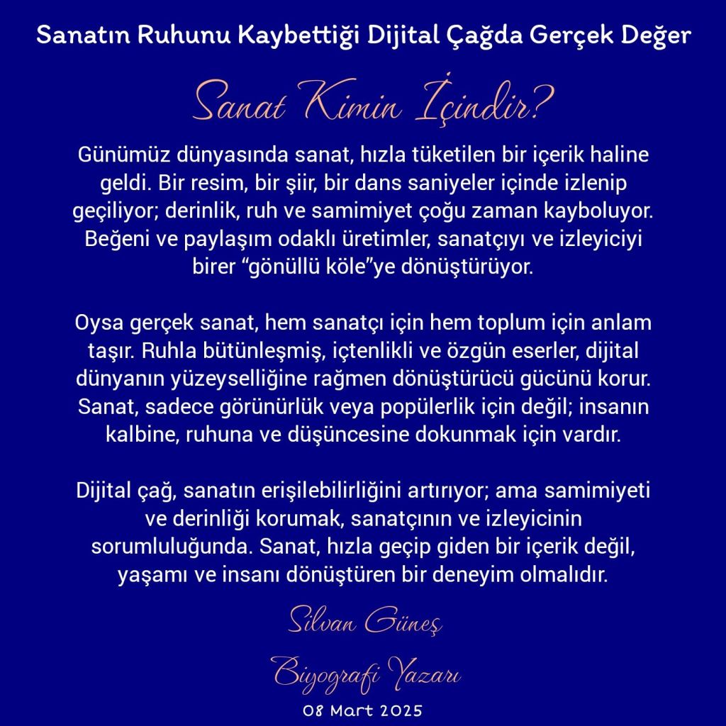 Sanatı sanat için mi yoksa insan için mi olduğunu kabul eden dönemlerin insanları, “Sanat sanat için midir yoksa insan için midir?” tartışmasının ve önermesinin sonucu ne olursa olsun, sonuçta her iki düşünceyi de tartışanlar gerçekten sanata, sanatçıya ve üretime değer veriyor, bu mutlak değer yargısı üstünden fikirlerini beyan ediyorlardı, şimdi ise sanat yok, sanatçı yok, işin ruhundan bahsetmek mümkün dahi değilken, insancıklar bu sanal dünyanın beyinlerinde yarattığı işçi sınıfının birer gönüllü köleliği içinde tıpkı mangal kömürünün için için yanan odunları gibi kendilerini madenden sayıyorlar! “Sanat sanat için midir yoksa toplum için midir?” sorularının yaşandığı dönemler geride kaldı? Ben bu yüzyılın insanına yakışan bir soru ürettim. “Sabat kimin içindir?”
