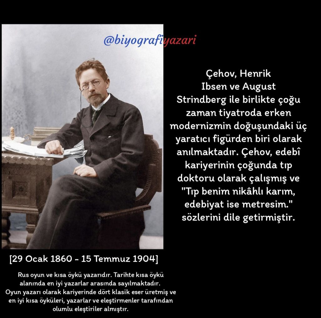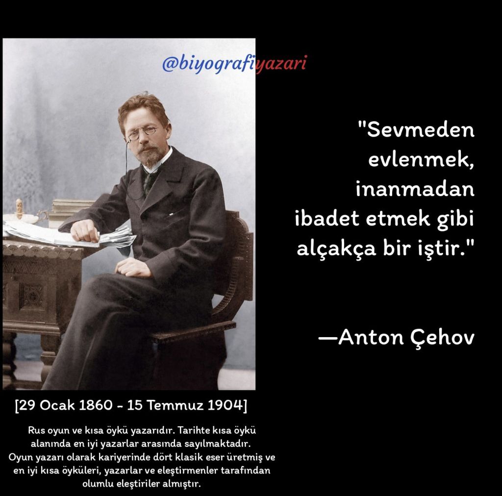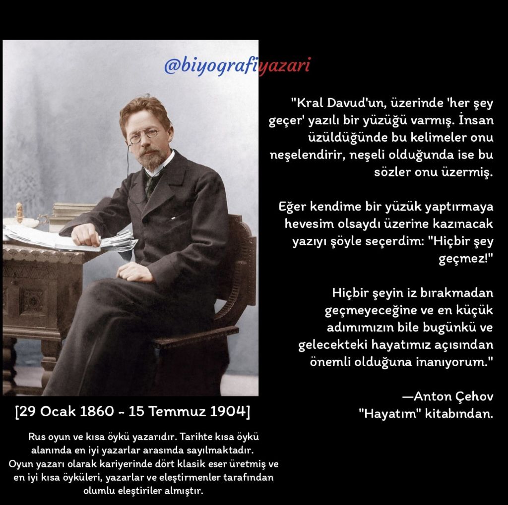 Çehov’un ilk paylaştığım sözünü bundan 40 yıl önce lise yıllarımda duymuştum. Tıpkı buradaki kalıpta olduğu gibi, her şeye uyarlayıp sarfedebileceğimiz bir cümle yapısının geçerliliğini dünya döndükçe koruyacağını bilmenizde şaşılacak bir şey yok!