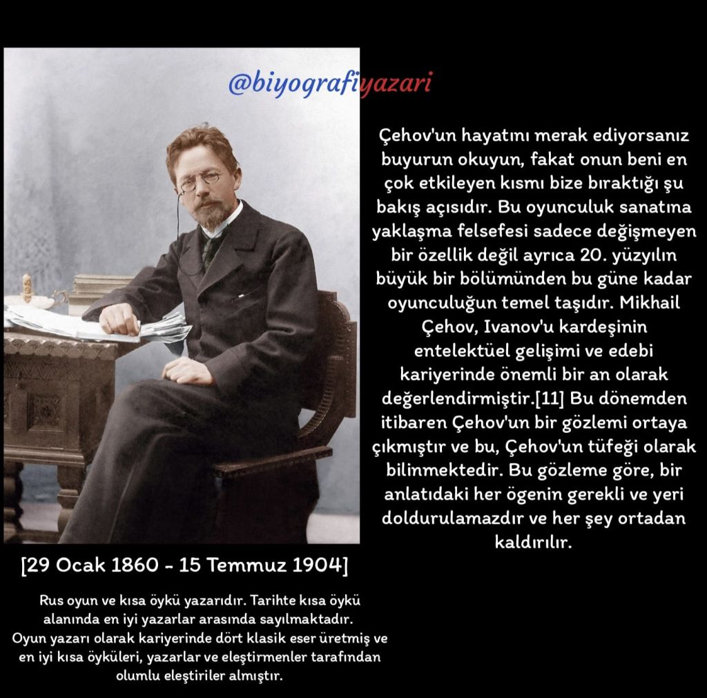 Çehov’un hayatını merak ediyorsanız buyurun okuyun, fakat onun beni en çok etkileyen kısmı bize bıraktığı şu bakış açısıdır. Bu oyunculuk sanatına yaklaşma felsefesi sadece değişmeyen bir özellik değil ayrıca 20. yüzyılın büyük bir bölümünden bu güne kadar oyunculuğun temel taşıdır. Mikhail Çehov, Ivanov’u kardeşinin entelektüel gelişimi ve edebi kariyerinde önemli bir an olarak değerlendirmiştir. Bu dönemden itibaren Çehov’un bir gözlemi ortaya çıkmıştır ve bu, Çehov’un tüfeği olarak bilinmektedir. Bu gözleme göre, bir anlatıdaki her ögenin gerekli ve yeri doldurulamazdır ve her şey ortadan kaldırılır.