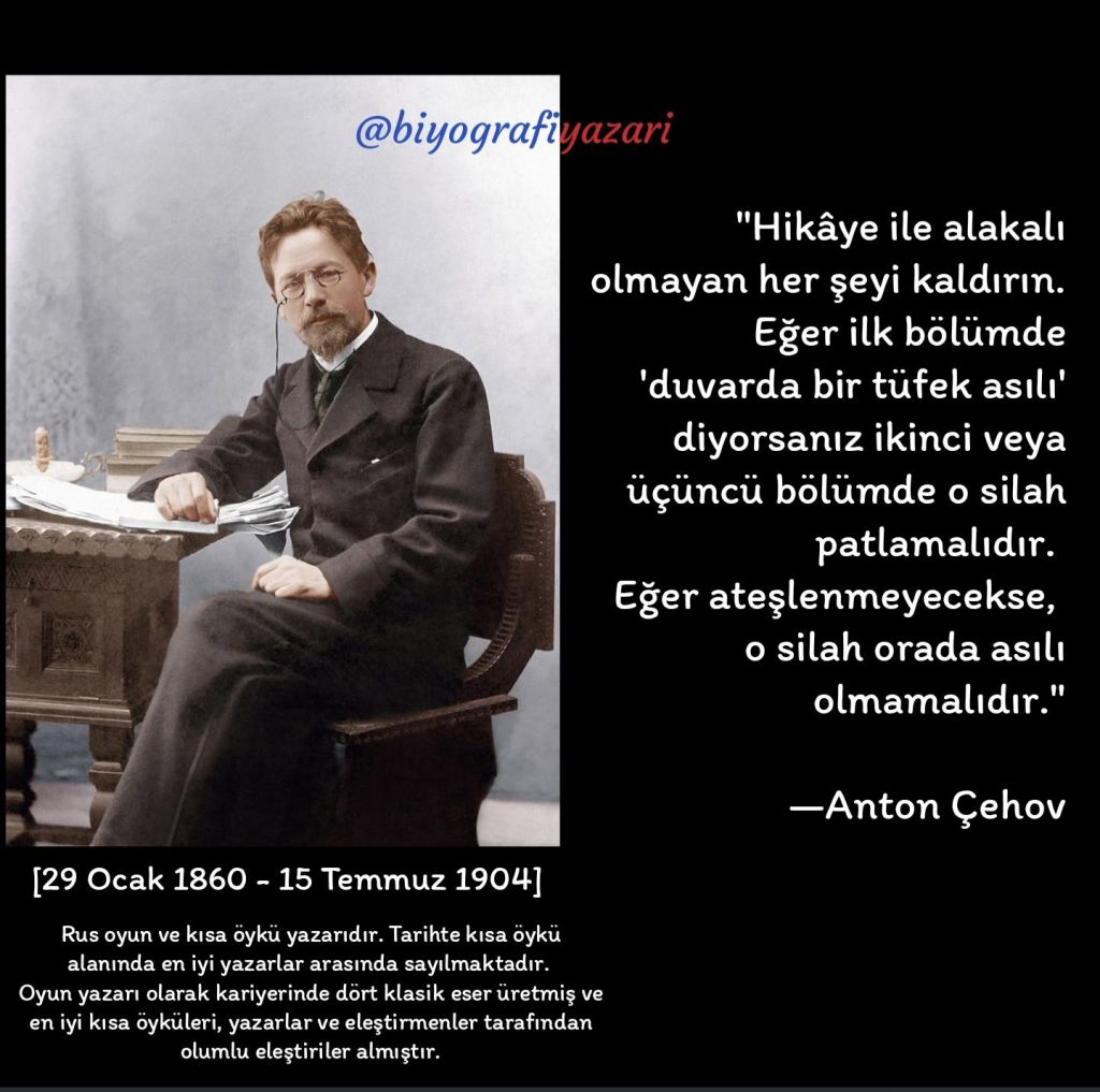 İşte böyle söylüyor Çehov, aslında bu söylediği sadece bir hikâye ya da tiyatroyu ilgilendiren, yazara, senarist’e, ‘bak bunlara dikkat et’ diyen bir öğüt değil. #AntonÇehov her ne kadar bunu edebiyat ve sahne sanatları üzerine söylemiş olsa da bu çok kıymetli cümle hayatımızın her alanında yerini koyuyor. Gereksiz cümle, eşya, insan ve sahip olduğumuz ve olmaya çalıştığımız her şey için bu geçerli. Doğaya çıktığımda durduk yere hemen önümdeki taşı yerinden alıp başka bir yere koyarak onu yurdundan etmek gibi bir şey. Gereksiz işler, paylaşımlar, düşüncesizliklerin üstünüze attığı toz, kül, buhar, buğu!..
