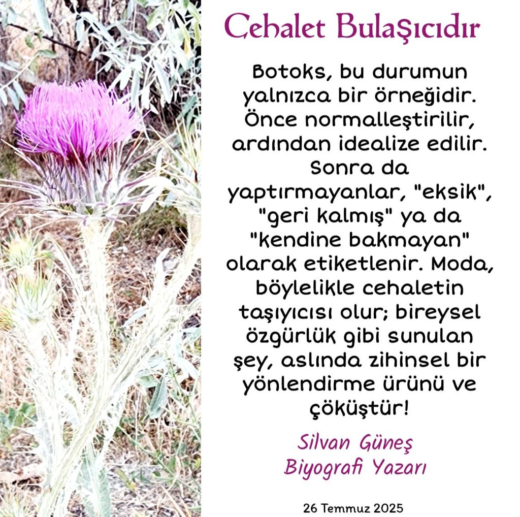 Botoks, bu durumun yalnızca bir örneğidir. Önce normalleştirilir, ardından idealize edilir. Sonra da yaptırmayanlar, “eksik”, “geri kalmış” ya da “kendine bakmayan” olarak etiketlenir. Moda, böylelikle cehaletin taşıyıcısı olur; bireysel özgürlük gibi sunulan şey, aslında zihinsel bir yönlendirme ürünü ve çöküştür.