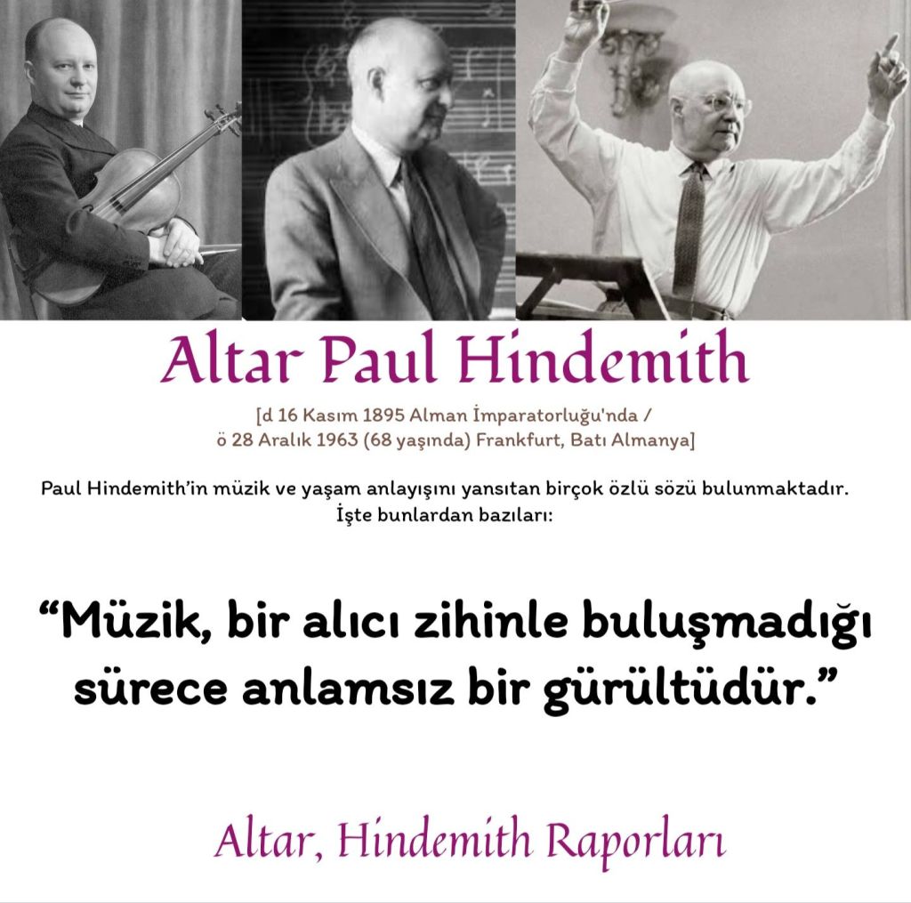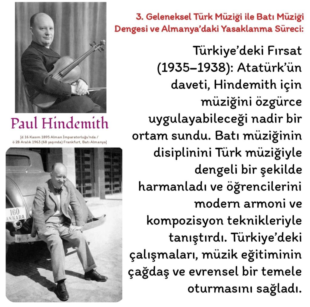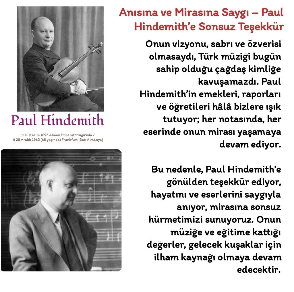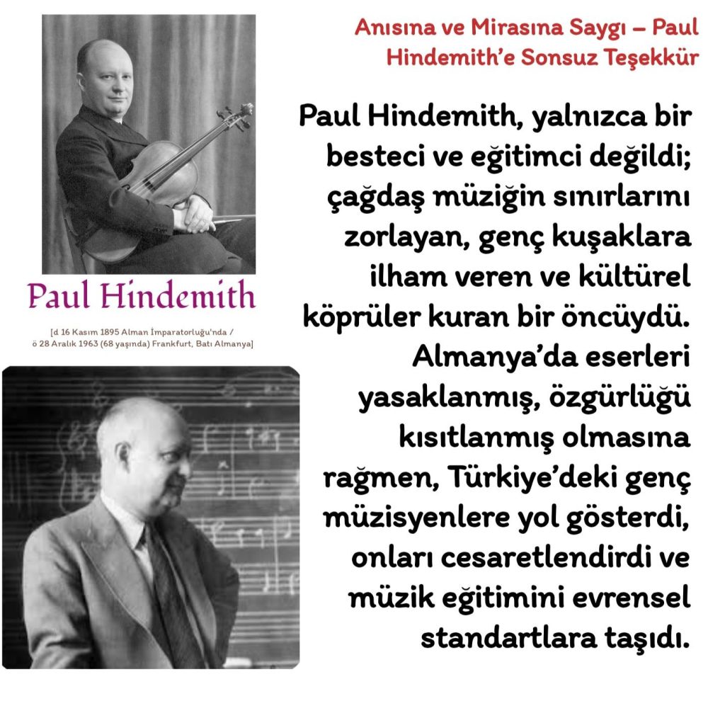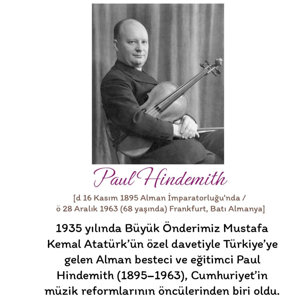 1935 yılında Mustafa Kemal Atatürk’ün özel davetiyle Türkiye’ye gelen Alman besteci ve eğitimci Paul Hindemith (1895–1963), Cumhuriyet’in müzik reformlarının öncülerinden biri oldu. Hindemith, Ankara Devlet Konservatuvarı’nın kuruluşunda aktif rol oynadı, eğitim programlarını çağdaş standartlara uyarladı ve opera sanatının kurumsallaşmasına katkıda bulundu. 1935–1938 yılları arasında aralıklı olarak Ankara’ya gelerek uygulamaları denetledi ve raporlar hazırladı. Günümüzde, Hindemith’in Atatürk ile birlikte çekilmiş bir fotoğrafı bulunmamaktadır; varlığı ve katkıları yalnızca yazılı belgeler ve raporlarla belgelenmiştir.