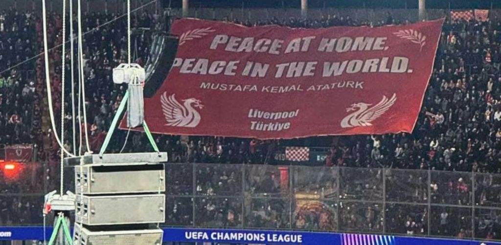 İstanbul’da oynanan Galatasaray – Liverpool FC maçında yaşanan bir görüntü, aslında yalnızca bir futbol tribününün değil, tarihin ve vicdanın meselesidir. İngiliz taraftarlar tribünde modern Türkiye’nin kurucusu Mustafa Kemal Atatürk’ün dünyaya miras bıraktığı barış ilkesini taşıyan bir pankart açtı: “Peace at Home, Peace in the World.”